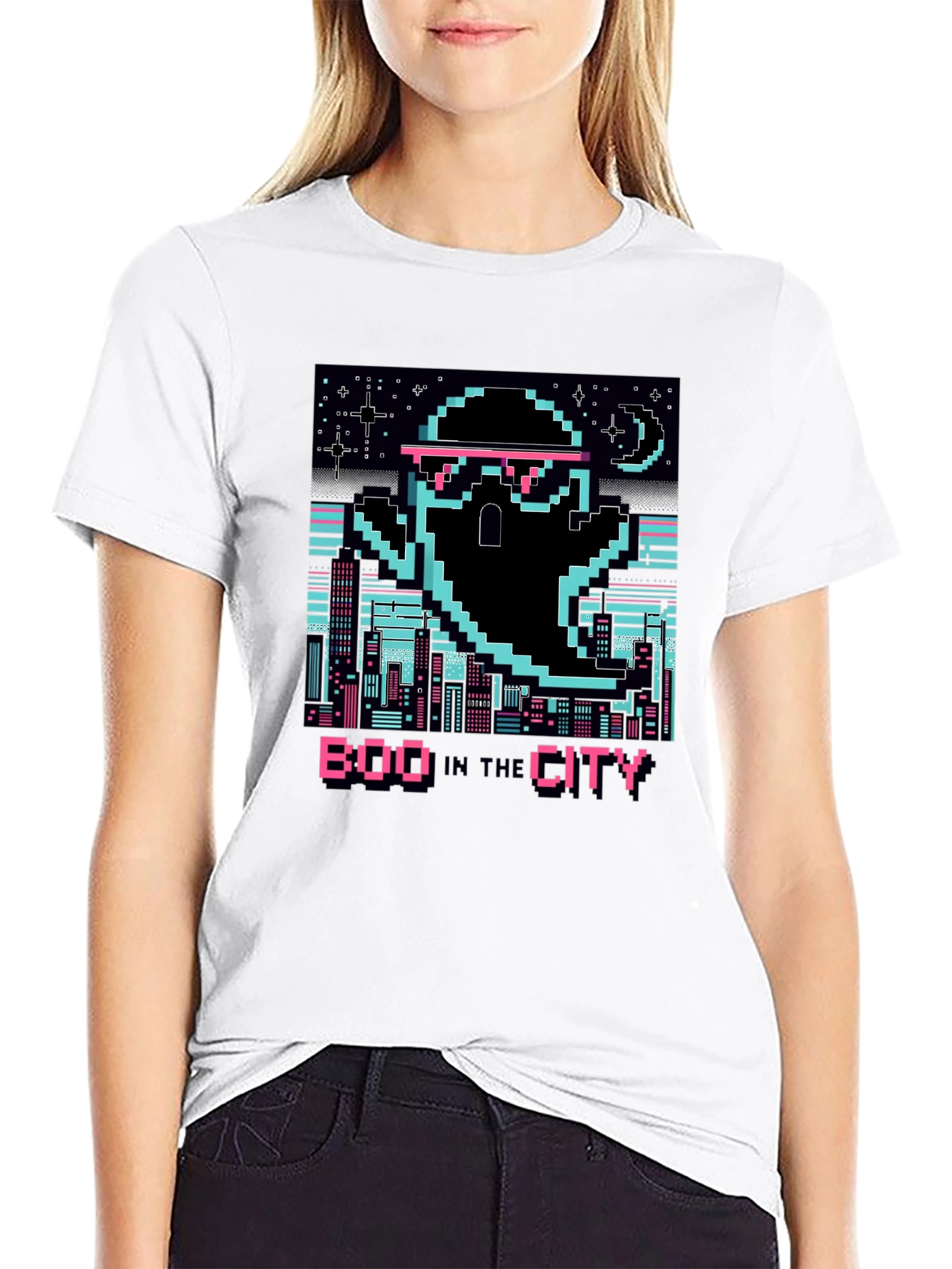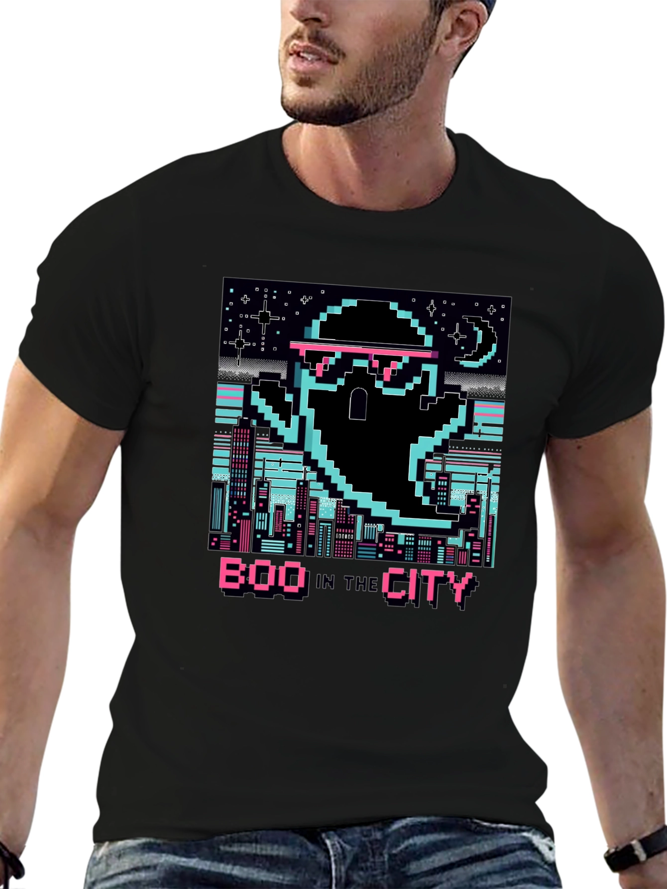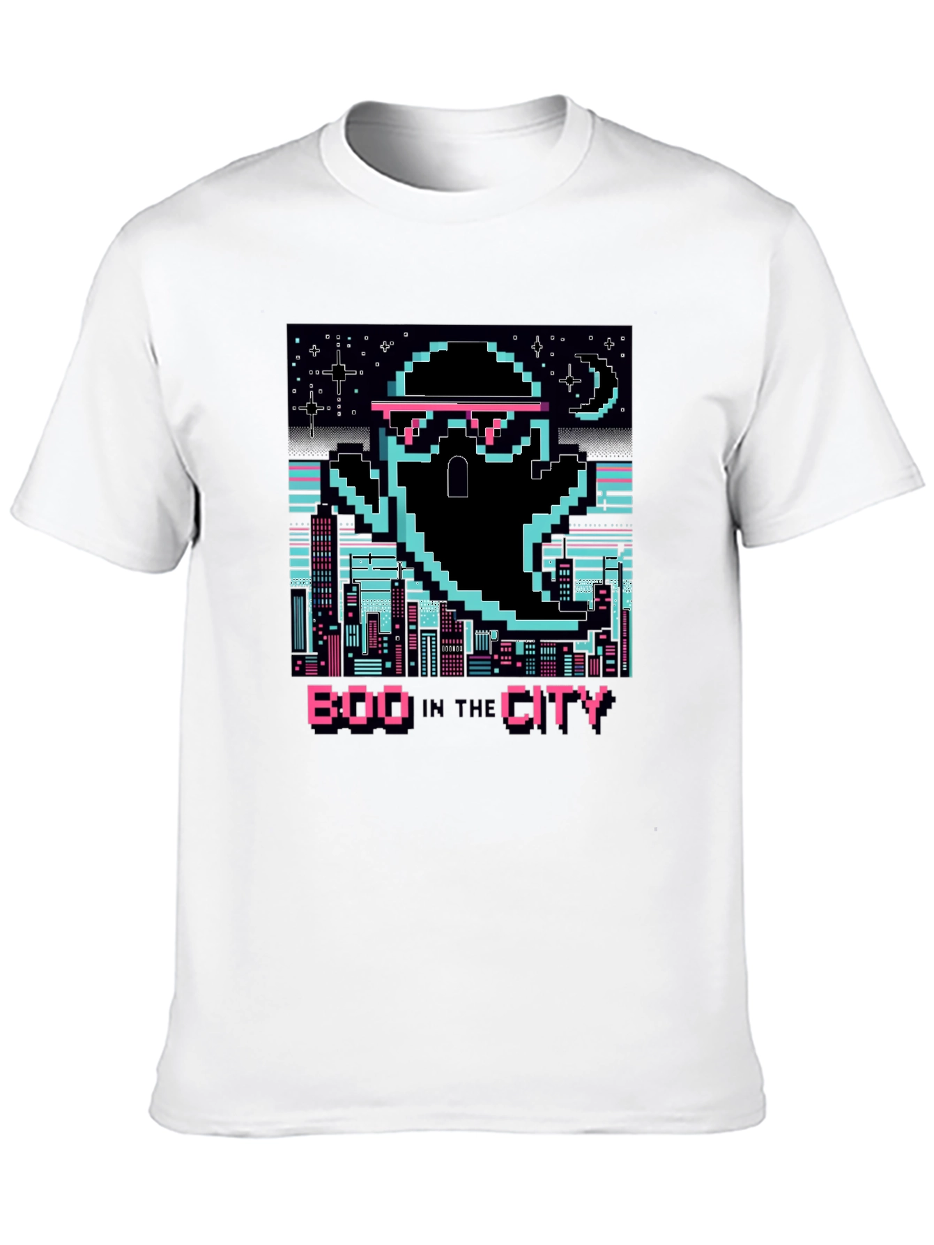 Show off your spooky style with this unique graphic tee! Featuring a pixelated ghost wearing sunglasses against a cityscape backdrop, complete with a starry night and neon accents, this shirt is sure to turn heads. The text “BOO IN THE CITY” adds a playful touch, perfect for Halloween or any fun occasion. Made from comfortable material, this tee is ideal for casual wear, parties, or everyday spooky style. Get yours today and haunt the city in style!