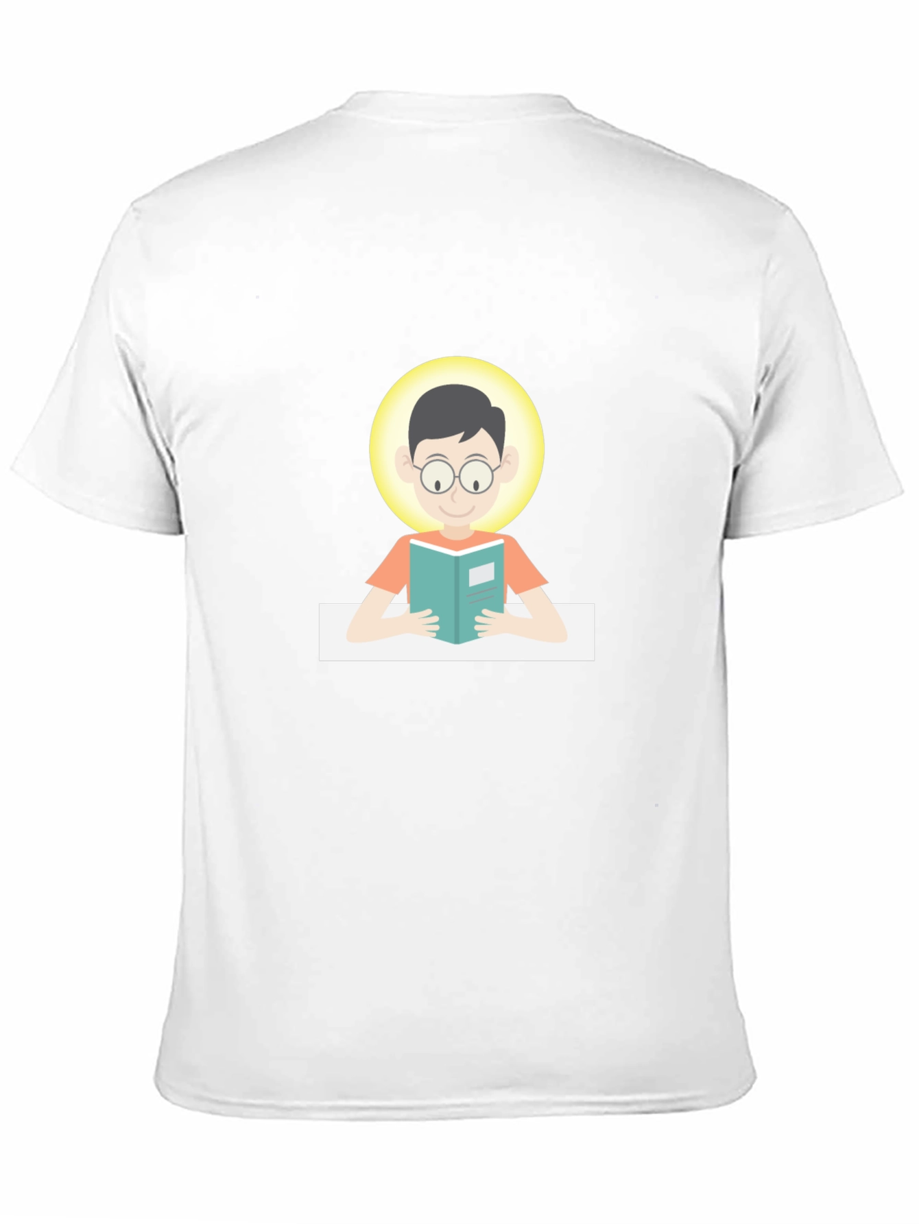 Showcase your love of reading with this quirky and cool black t-shirt. The tee features a graphic of a cartoon man with glasses reading a book, complete with a halo around his head. The crisp design is printed on a high-quality black fabric, creating a stylish contrast that's sure to turn heads. Perfect for students, teachers, librarians, or any book enthusiast, this t-shirt is a fun way to express your intellectual side. Comfortable and casual, it's ideal for everyday wear, book club meetings, or lounging around with your favorite novel. Add a touch of scholarly charm to your wardrobe with this unique tee!