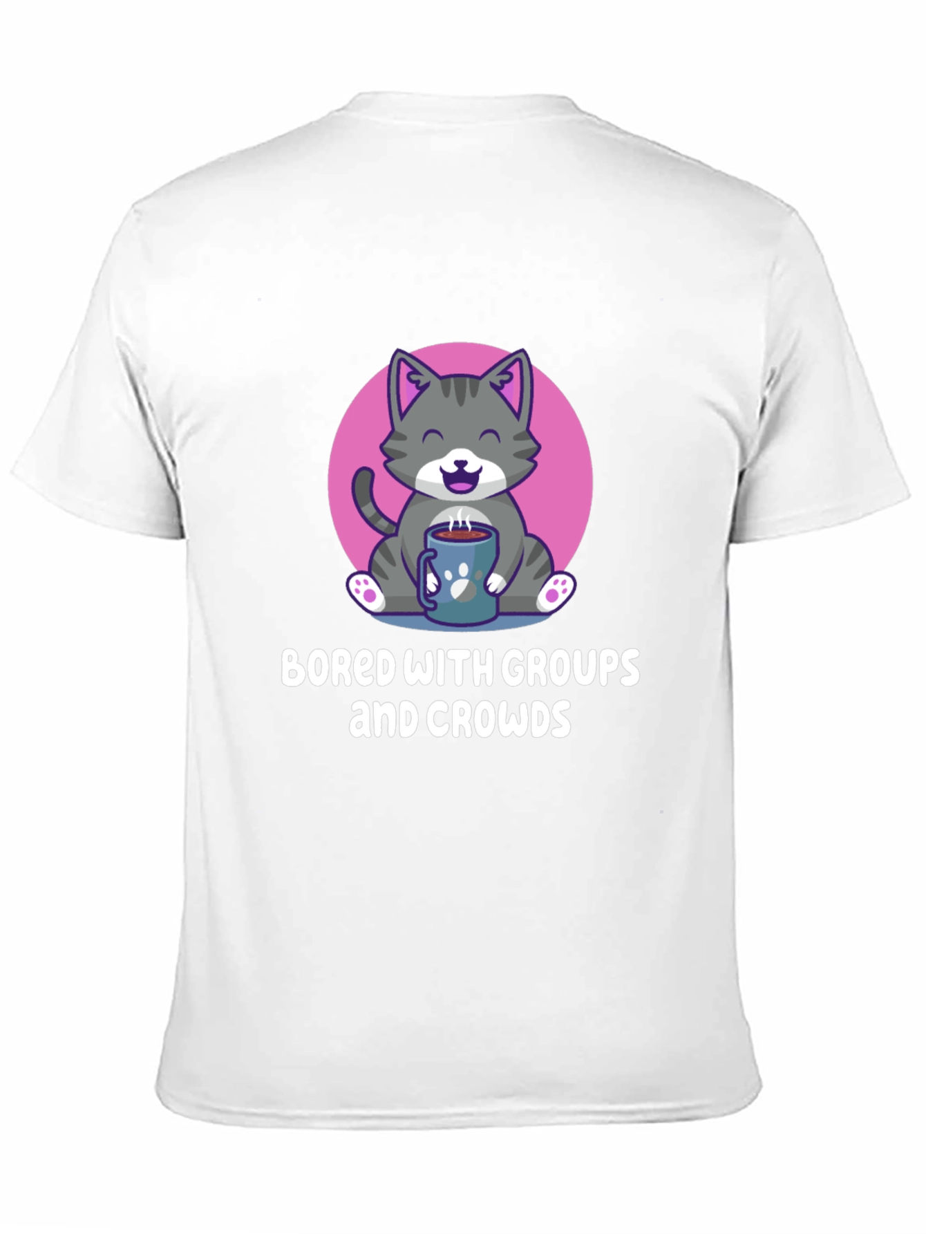 Express your introverted side with this quirky black t-shirt. Featuring a cute cartoon cat sitting within a pink circle, happily enjoying a warm drink in a paw-printed mug. The playful design is complemented by the humorous text "Bored With Groups And Crowds". Made from a comfortable-looking fabric, this shirt is perfect for casual wear, lounging at home, or making a statement about your love for quiet time. Ideal for cat lovers and introverts alike, this t-shirt is sure to be a conversation starter.