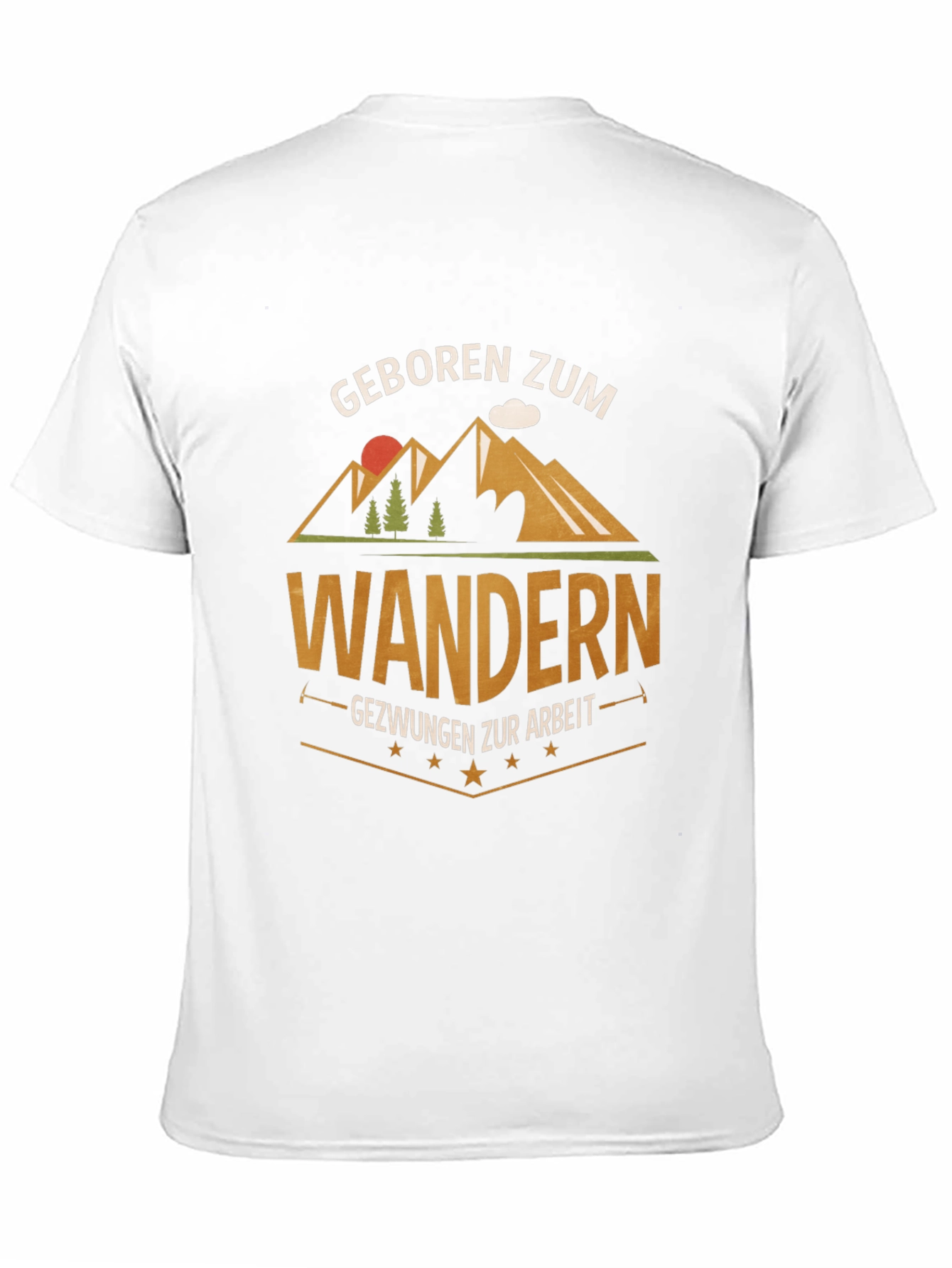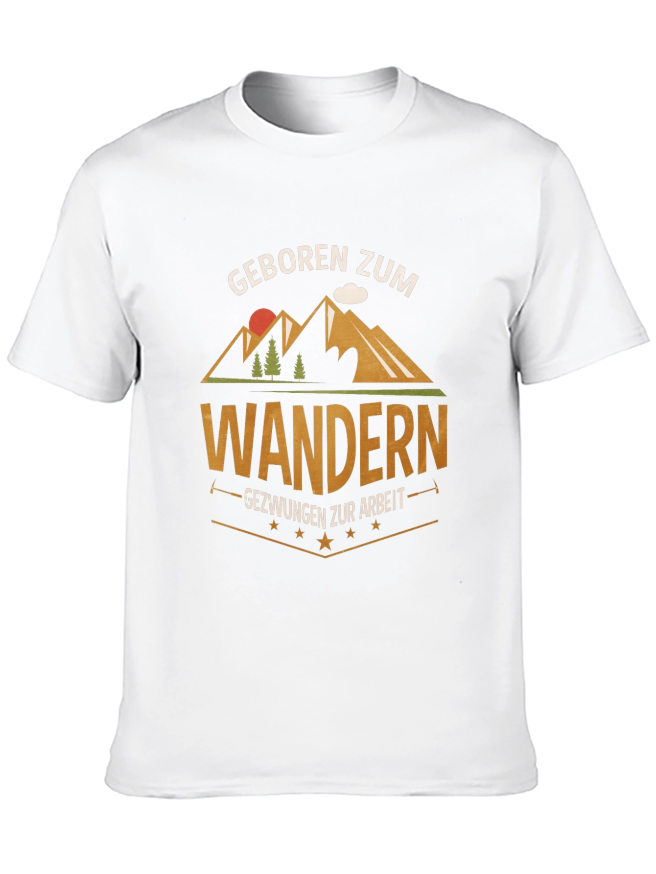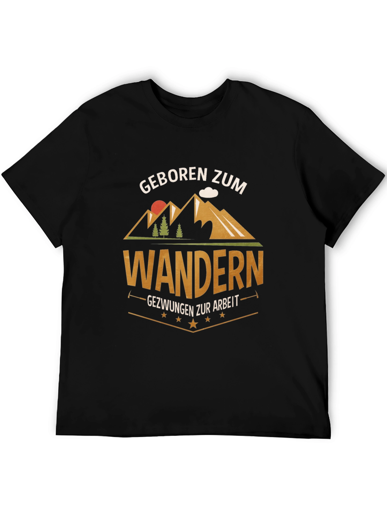 This black t-shirt features a whimsical design perfect for hiking enthusiasts. The graphic showcases stylized mountains with a rising sun, accompanied by the German phrase "Geboren zum Wandern" (Born to Hike) above, and "Gezwungen zur Arbeit" (Forced to Work) below. The golden brown "WANDERN" is sure to be a stand out hit! Made from a soft, comfortable fabric, this tee is ideal for casual wear or outdoor adventures. Show off your love for nature and the great outdoors with this unique and eye-catching t-shirt.