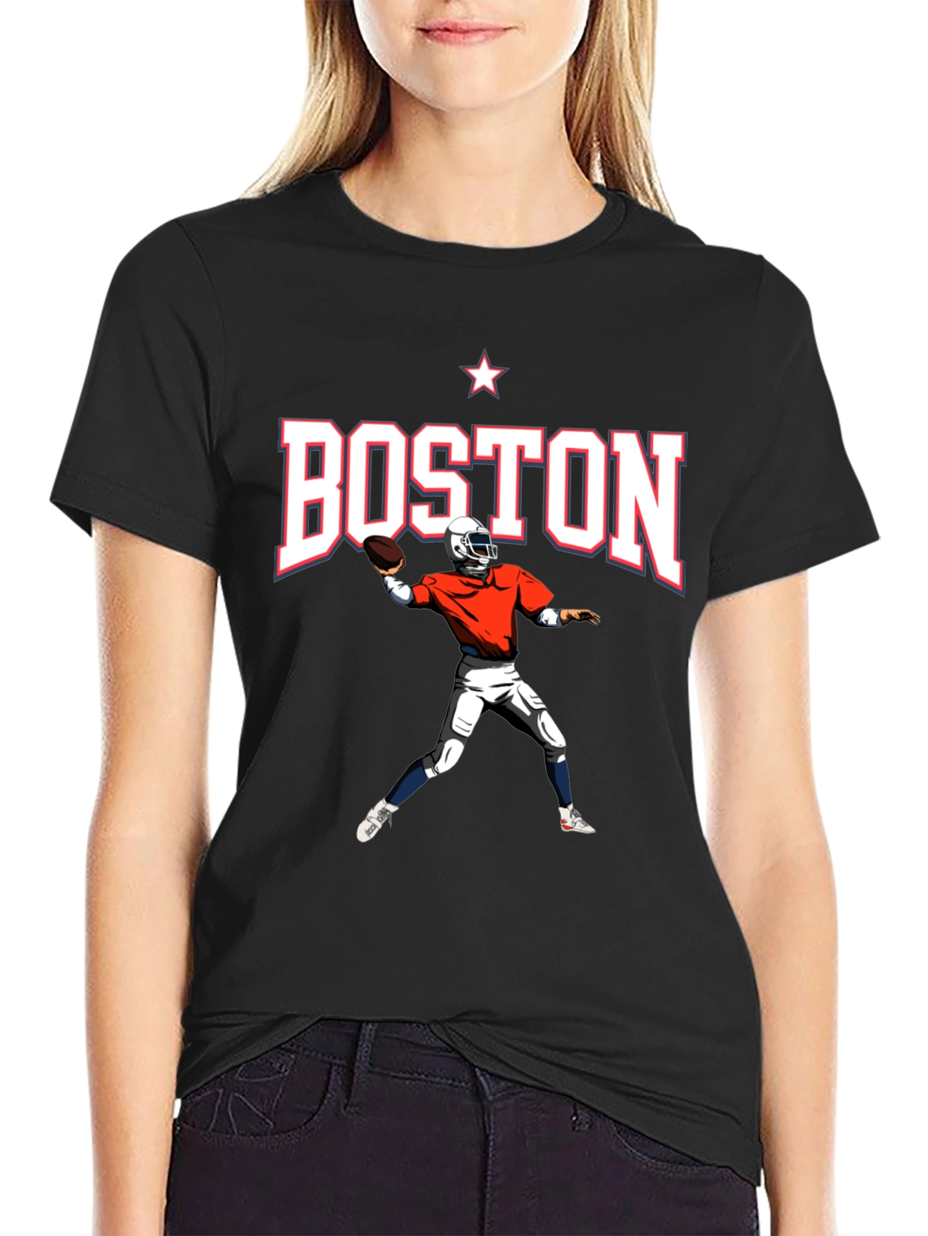 Show your team spirit with this stylish black t-shirt featuring a bold 'BOSTON' graphic and a star above. The eye-catching design includes an illustration of a football player in action, ready to make the throw. Perfect for game days, casual outings, or showing your Boston pride. Made from comfortable, breathable fabric, this tee ensures all-day comfort and durability. A must-have addition to any sports enthusiast's wardrobe, it’s a great way to support your city and team in style. Pair it with jeans or shorts for a relaxed, sporty look. Grab yours today and represent Boston with pride!