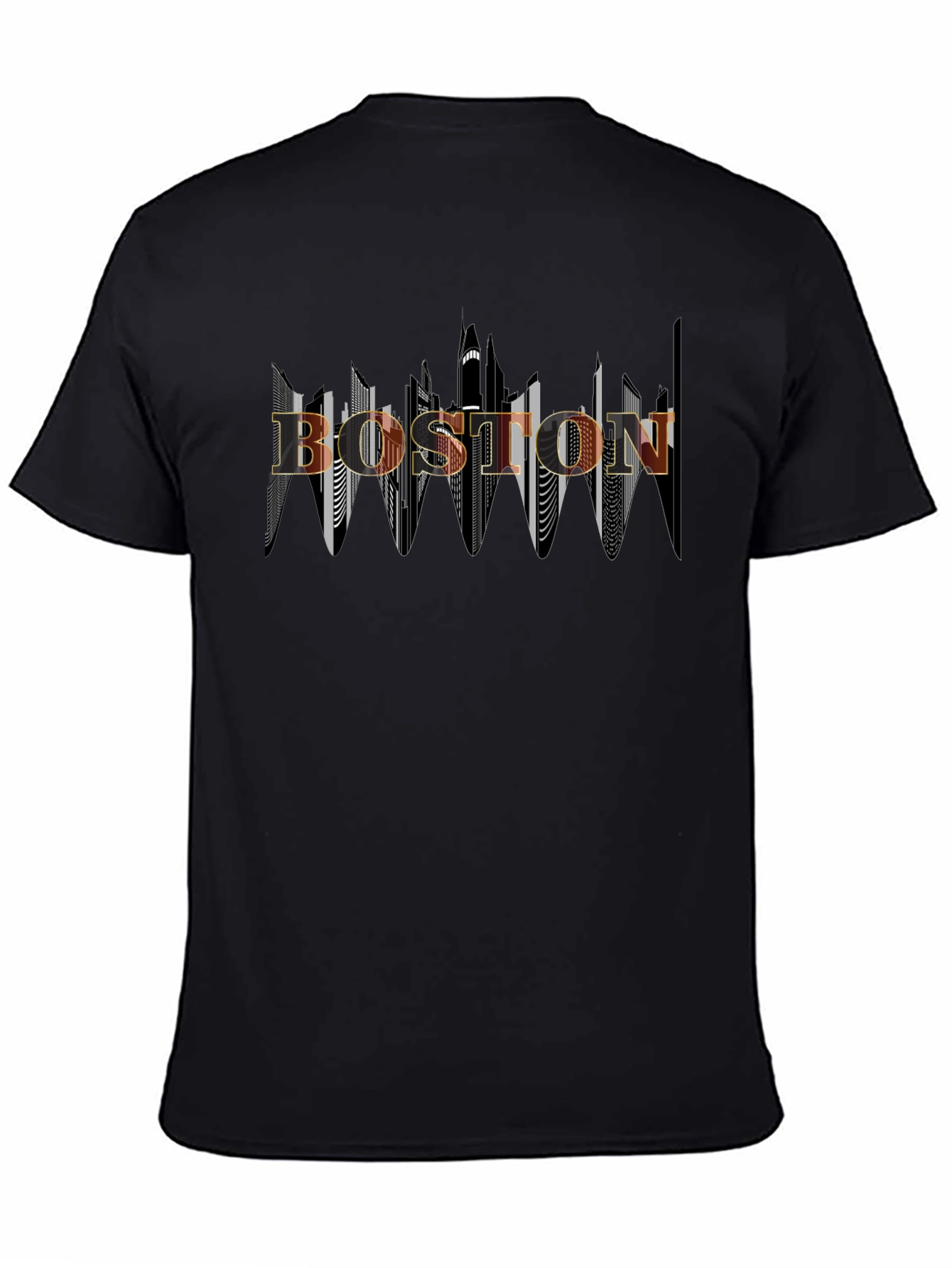 Show your love for Boston with this stylish black t-shirt. This tee features a unique graphic of the Boston skyline, creatively integrated with the city's name. The buildings create an awesome visual effect that's sure to turn heads. Made from a comfortable fabric, this shirt is perfect for everyday wear. The classic crew neck and short sleeves offer a relaxed fit. Pair it with jeans for a casual look or dress it up with chinos for a night out. A must-have for Bostonians and city lovers alike! Get yours today and represent your favorite city in style.