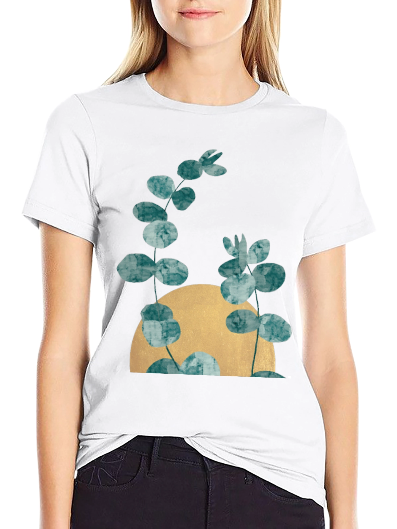 Elevate your everyday style with this unique botanical t-shirt. Featuring a modern design of stylized eucalyptus leaves against a golden moon backdrop, this black tee offers a sophisticated and nature-inspired aesthetic. The graphic is printed on a soft, comfortable fabric, ensuring all-day wearability. This versatile t-shirt can be effortlessly paired with jeans, chinos, or shorts, making it a perfect addition to any wardrobe. The classic black color provides a sleek and stylish look, while the eye-catching graphic adds a touch of personality and flair. Ideal for casual outings, weekend adventures, or simply relaxing at home, this botanical moon t-shirt is a must-have for those who appreciate contemporary design and natural elements.
