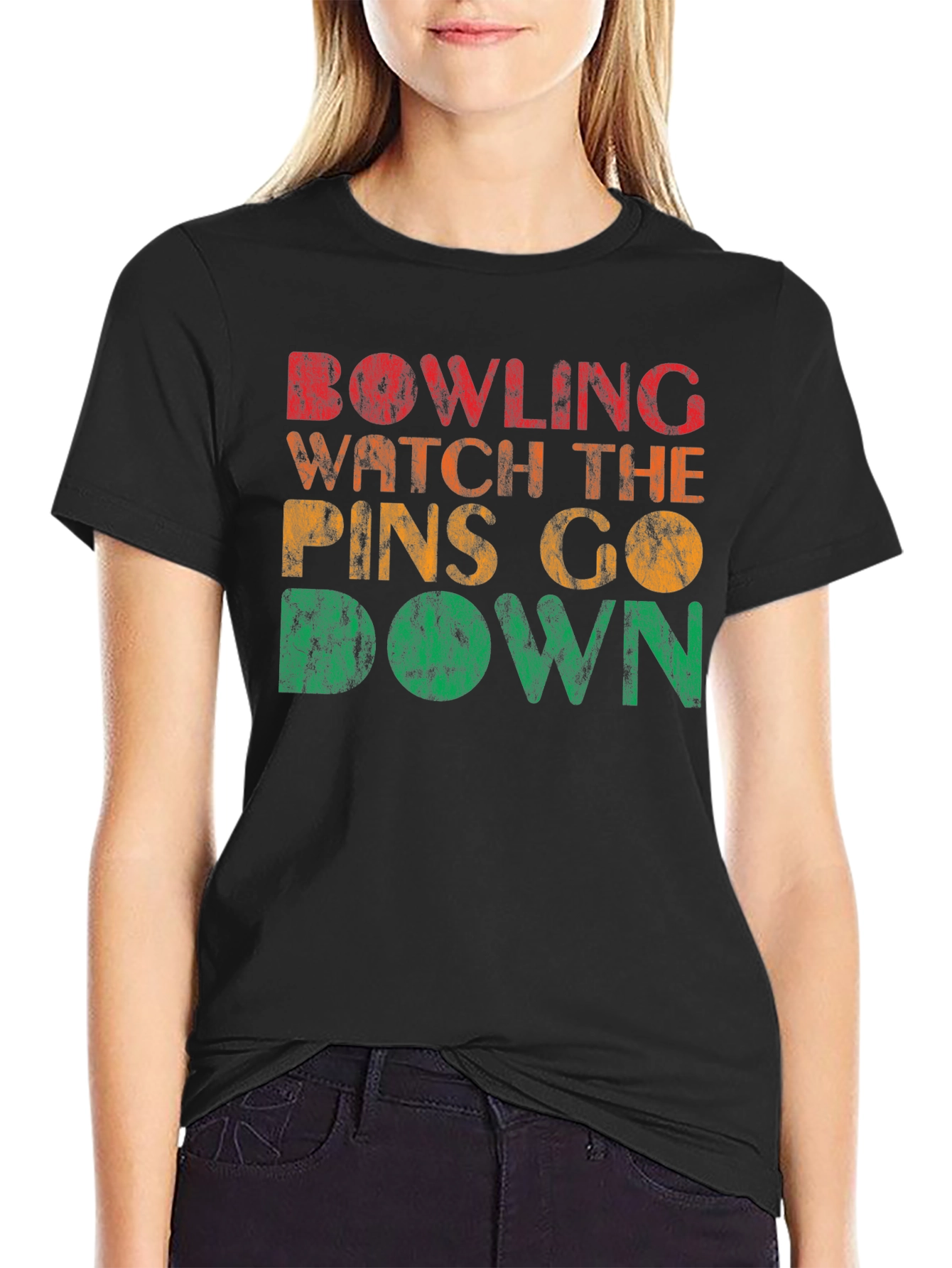 Show off your love for bowling with this eye-catching graphic tee! The shirt features the phrase "BOWLING WATCH THE PINS GO DOWN" in a stacked design, with a distressed texture effect. The words are colored in shades of red, orange, and green. This casual shirt is perfect for bowling nights, casual outings, or simply lounging in style. Made from a comfortable, breathable fabric, it's a must-have for any bowling enthusiast's wardrobe. Get ready to strike up some conversations with this unique tee!