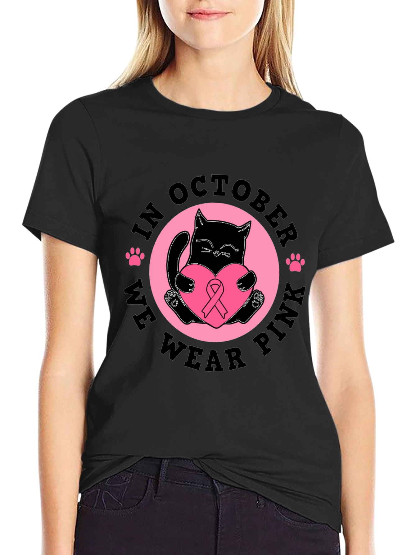Show your support with this stylish black t-shirt, featuring a unique design for Breast Cancer Awareness month. A charming black cat cradles a pink heart bearing the iconic pink ribbon symbol. The graphic is encircled by the phrase "In October, We Wear Pink" in bold lettering, accented by cute paw prints. Perfect for raising awareness and starting conversations. Made from a comfortable material, this t-shirt is ideal for everyday wear during October and beyond. A great gift idea for anyone who wants to make a statement of solidarity and support. Get yours today!