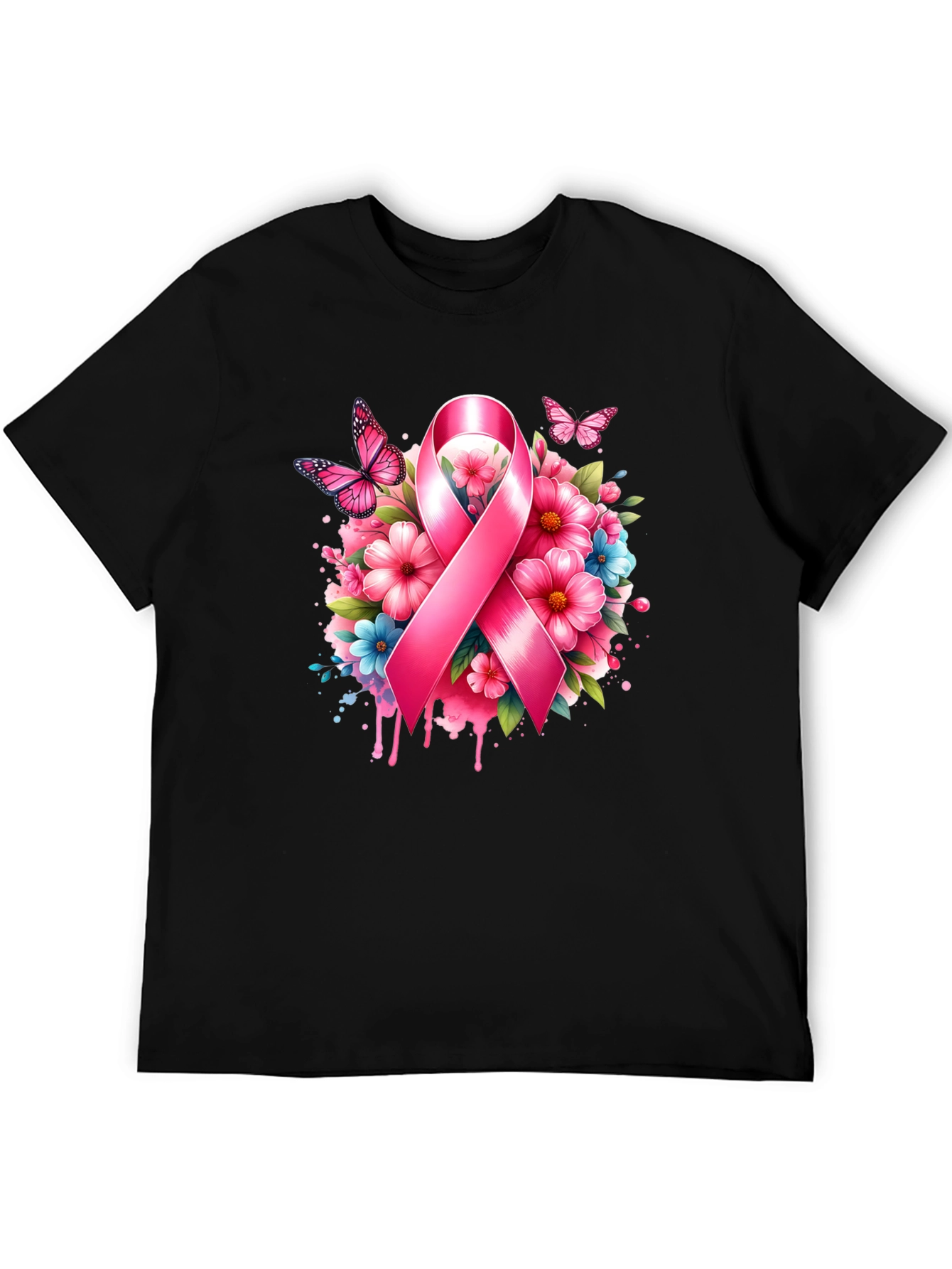 Show your support with this impactful black t-shirt featuring a vibrant breast cancer awareness design. A prominent pink ribbon is surrounded by beautifully rendered pink and blue flowers, accented with delicate butterflies. The design incorporates a watercolor effect, adding a touch of artistic flair. The shirt is made of a comfortable material, perfect for everyday wear. Ideal for breast cancer awareness walks, events, or as a thoughtful gift to show your support for survivors and those currently battling the disease. Wear your heart on your sleeve with this meaningful and stylish t-shirt.