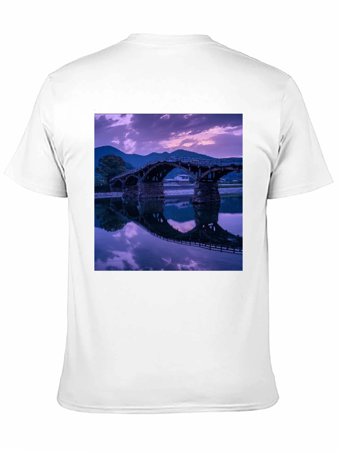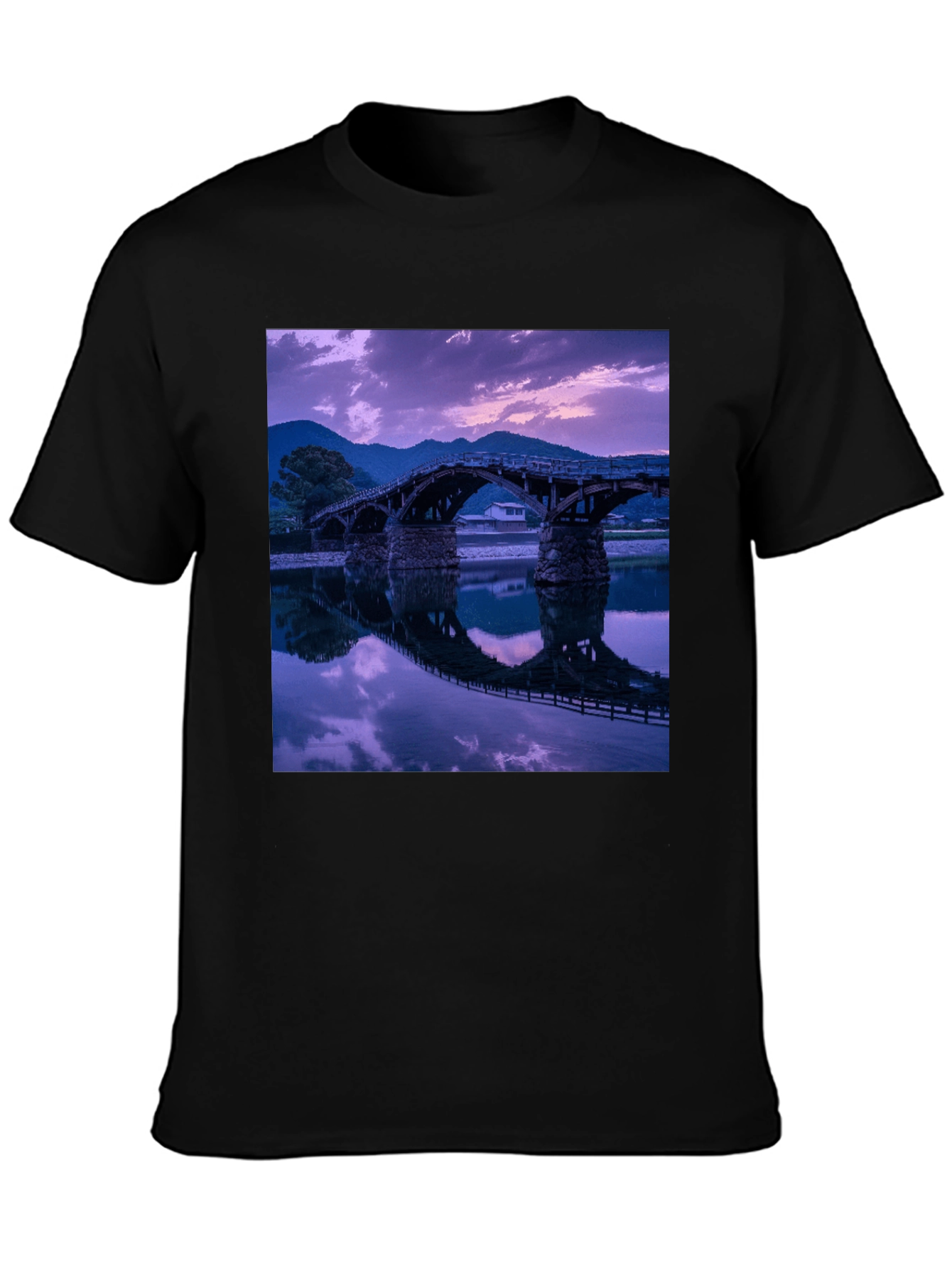 This stylish black tee features a captivating graphic of a historic bridge reflected in calm water against a vibrant twilight sky. The detailed image adds a touch of tranquility and sophistication to your casual wardrobe. Made from comfortable materials, this t-shirt is perfect for everyday wear, whether you're exploring the city or relaxing at home. Its unique design makes it a great conversation starter, showcasing your appreciation for art and architecture. Stand out with this eye-catching and comfortable tee that blends artistic flair with everyday comfort.