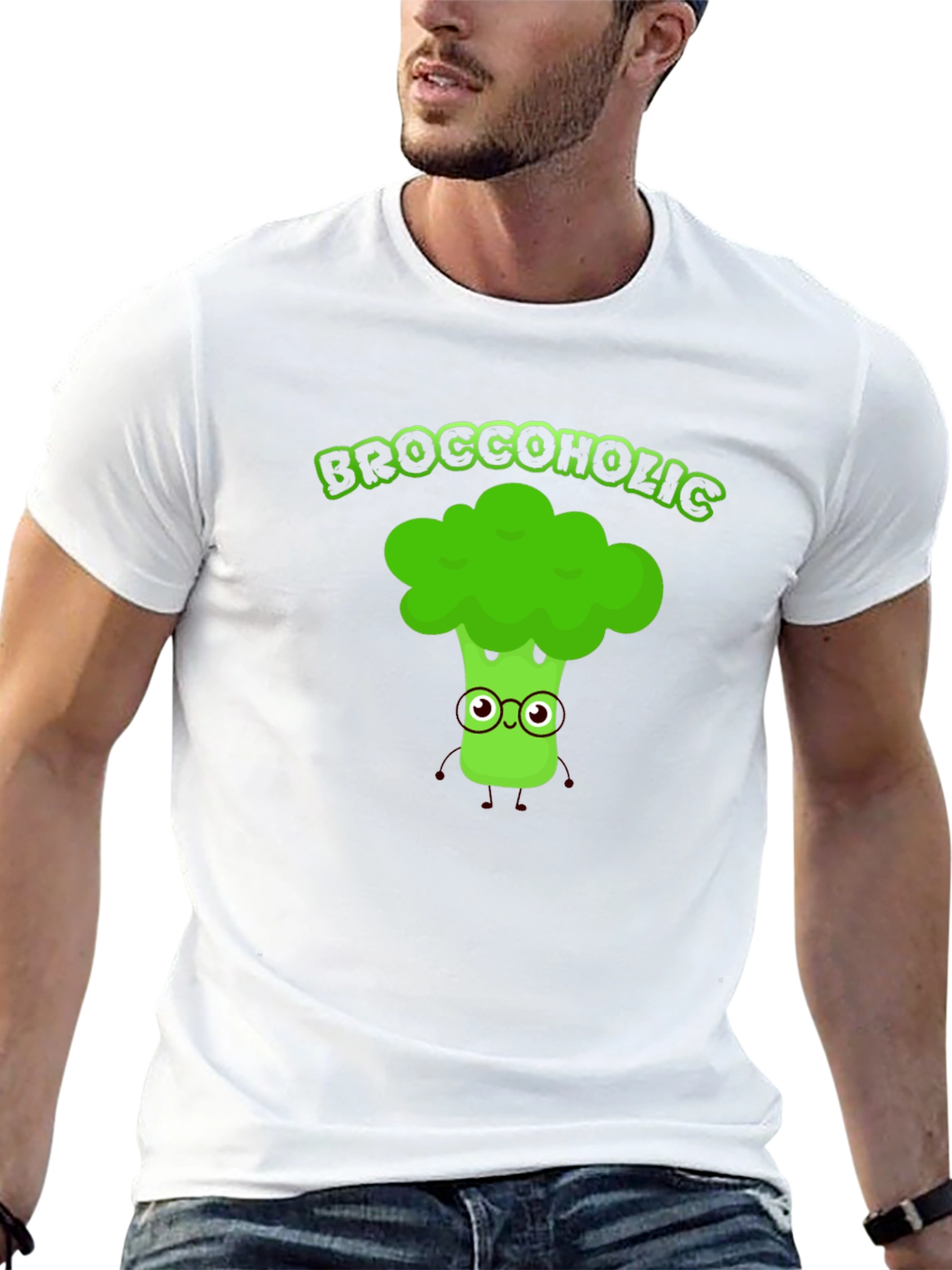 Show your love for broccoli with this fun "Broccoholic" t-shirt! This black, short-sleeved tee features a vibrant, cartoon broccoli character sporting round glasses and a cheerful expression. The word "BROCCOHOLIC" is printed above the broccoli graphic in bright green, adding to the playful design. Made from a comfortable-looking fabric, this shirt is perfect for everyday wear, whether you're hitting the gym, running errands, or just lounging at home. A great conversation starter and a fun way to express your healthy eating habits, this t-shirt makes a unique addition to any wardrobe or a thoughtful gift for the broccoli enthusiast in your life.