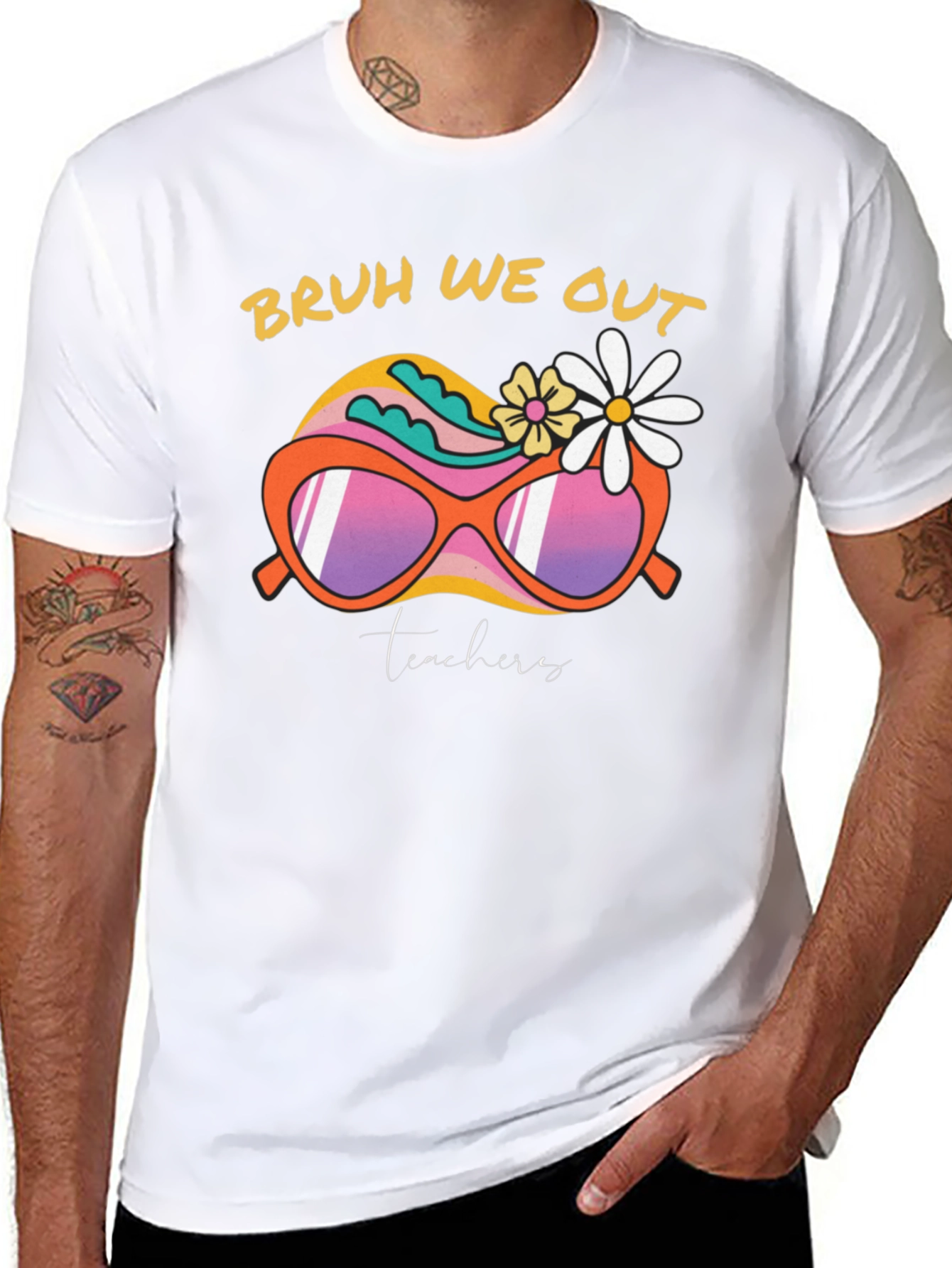 Show off your teacher pride with this eye-catching black graphic t-shirt. This tee features a fun, retro-inspired design with sunglasses, flowers, and the phrase "Bruh We Out Teachers." Made from a comfortable fabric, it's perfect for casual wear, school events, or just relaxing after a long day of teaching. The vibrant graphic adds a touch of personality to your wardrobe, making it a great conversation starter. Whether you're ending the school year or just taking a break, this t-shirt is the perfect way to express your teacher spirit in style. Get yours today!