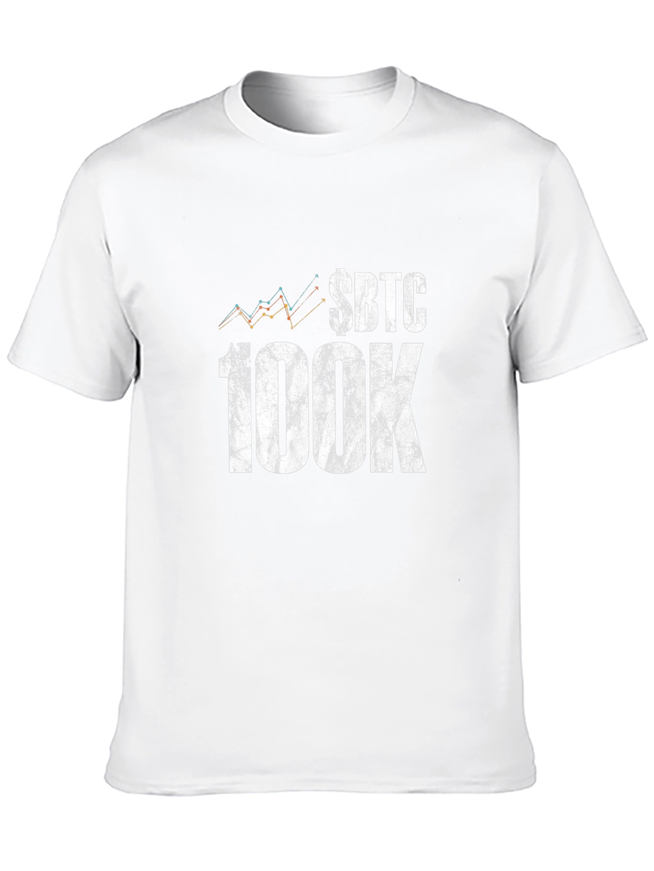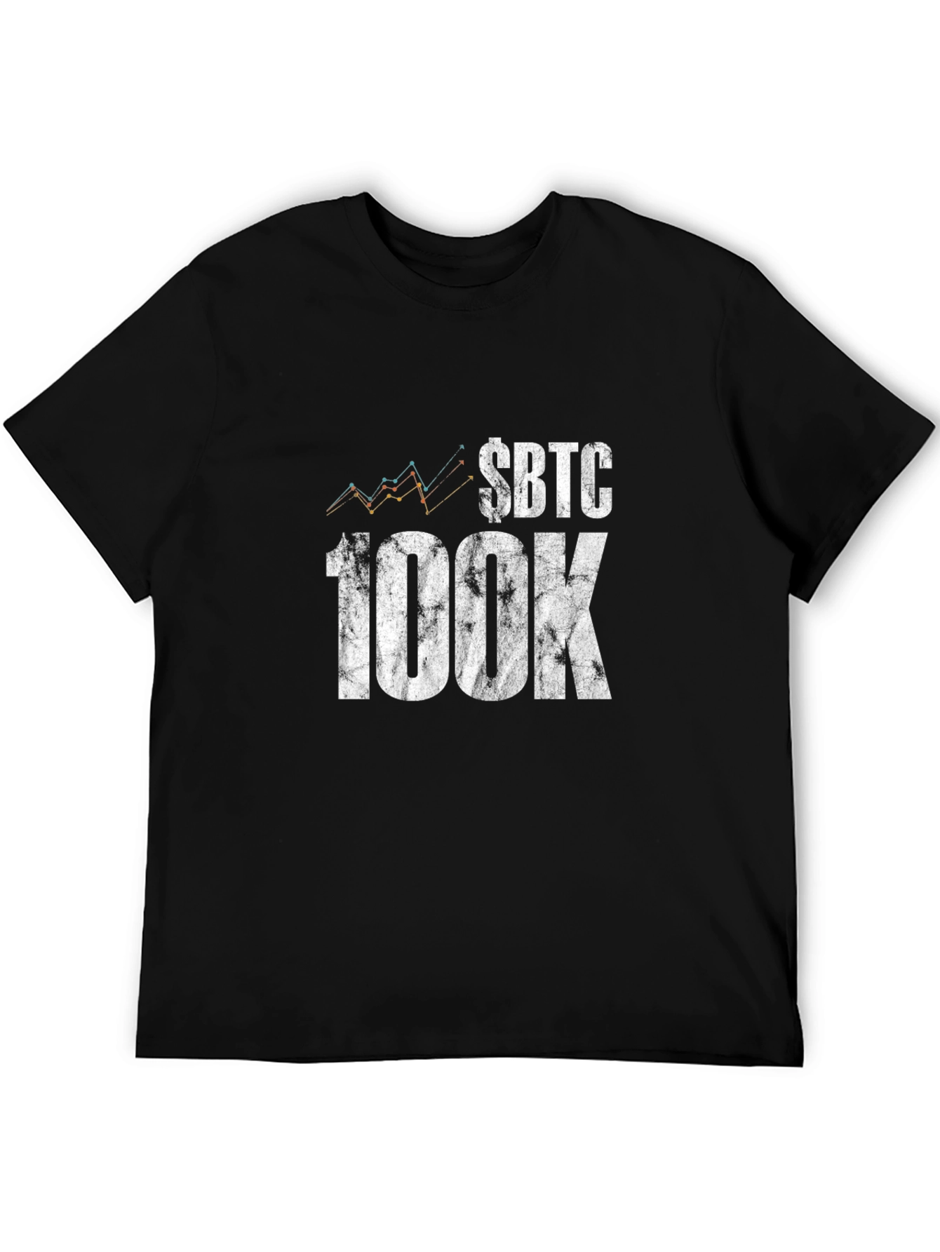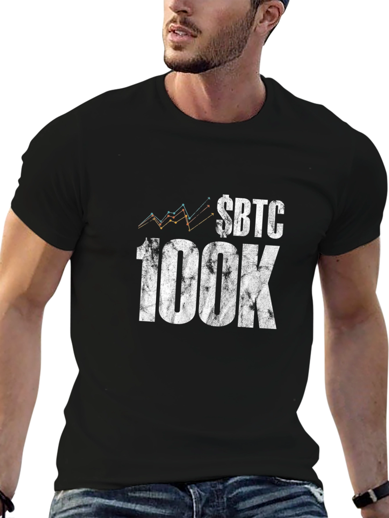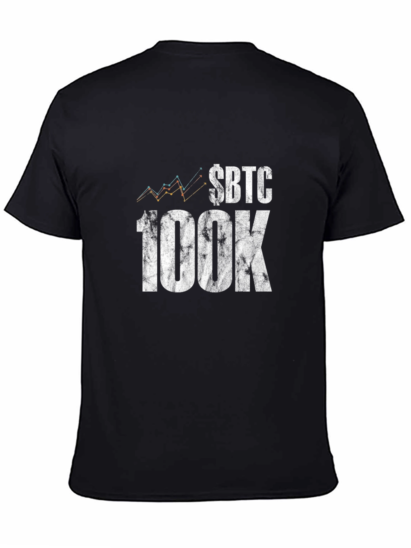 Show your support for the future of cryptocurrency with this stylish black t-shirt. Featuring a bold design of "$BTC 100K" alongside a rising graph, this shirt is perfect for crypto enthusiasts. The graphic has a distressed look for a vintage feel. Made from comfortable materials, this tee is ideal for casual wear, crypto meetups, or as a statement piece to showcase your investment confidence. Wear your digital asset pride with this unique and eye-catching t-shirt!