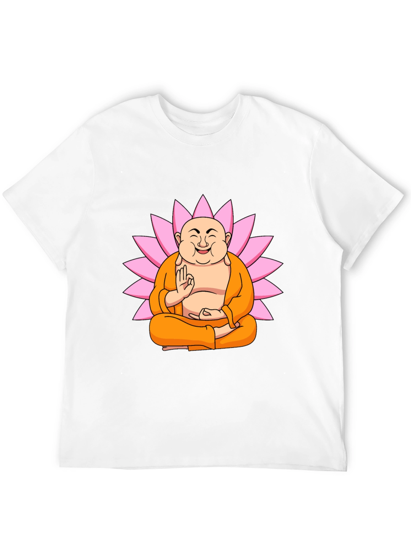 Embrace tranquility with this unique graphic tee. Featuring a cheerful Buddha character in meditation pose, set against a vibrant pink lotus flower, this black t-shirt offers both style and comfort. The design is eye-catching and the fabric appears soft, promising a pleasant wearing experience. Ideal for casual outings, yoga sessions, or simply relaxing at home, this tee is a great conversation starter. Show off your appreciation for mindfulness and Eastern culture with this distinctive and comfortable wardrobe addition. Perfect for those seeking a blend of fashion and zen.