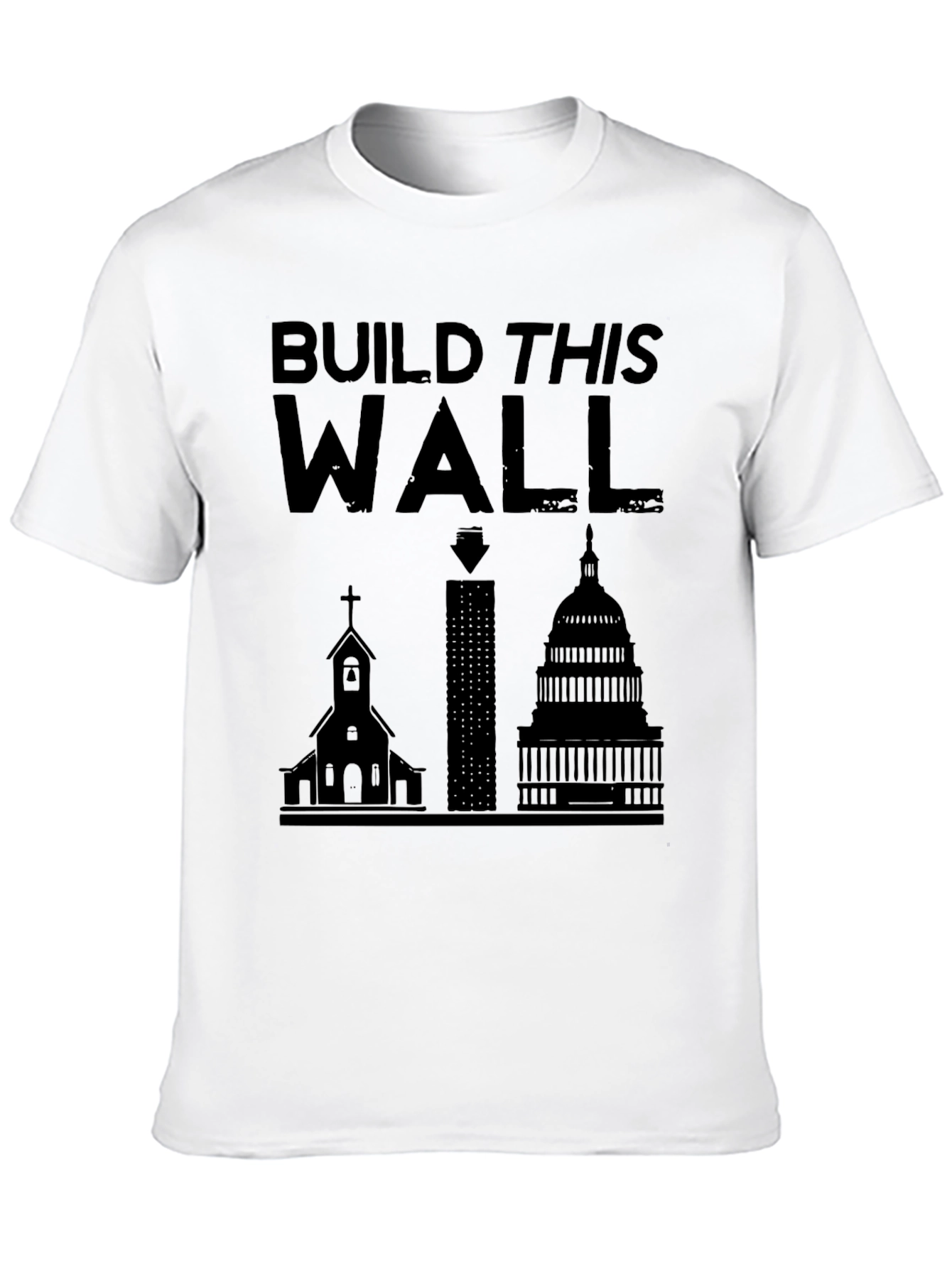 Show your support with this bold graphic tee. This black t-shirt features the phrase "Build This Wall" above a stylized image depicting a church, a tower, and the capitol building, divided by a wall. The dark print on the black fabric creates a striking, modern look. Made from soft, breathable cotton, this tee offers all-day comfort. Perfect for rallies, casual outings, or as a statement piece in your wardrobe. Make a statement and show your beliefs with this unique and eye-catching tee.