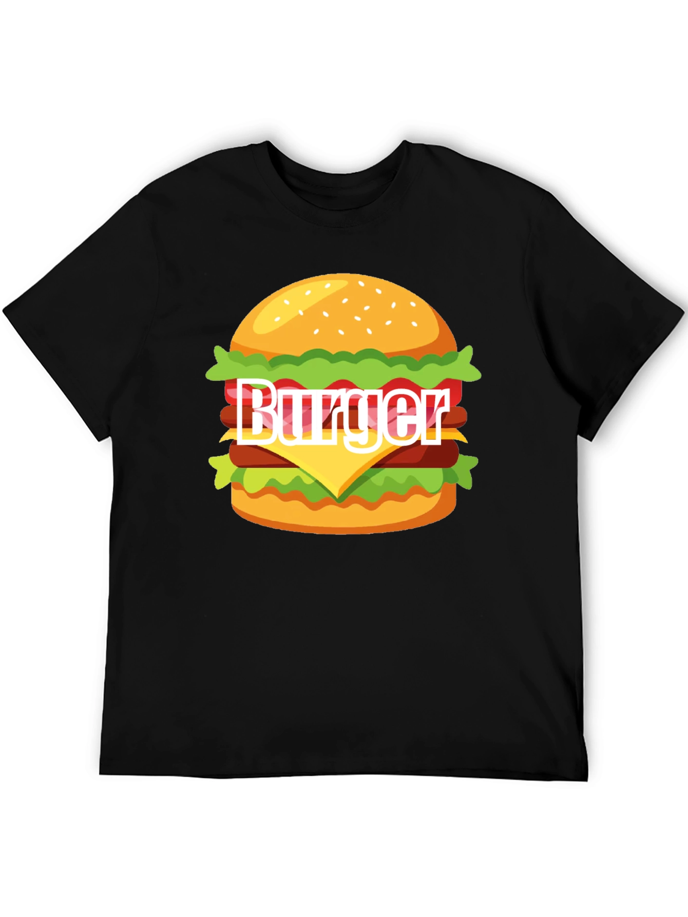 Show your love for burgers with this fun and stylish graphic tee! The shirt features a vibrant and detailed cartoon-style burger design, complete with layers of lettuce, cheese, patty, and a sesame seed bun. The word "Burger" is playfully integrated into the design. Made from a comfortable black fabric, this tee is perfect for casual wear, burger enthusiasts, or anyone looking to add a touch of fun to their wardrobe. Pair it with jeans or shorts for a relaxed and eye-catching look. Ideal for cookouts, casual outings, or simply expressing your love for everyone's favorite food.