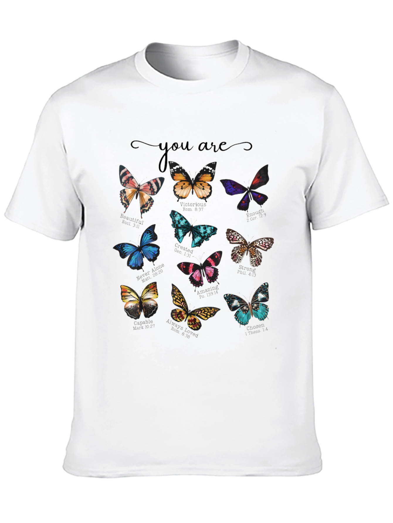 Show off your whimsical style with this black graphic t-shirt. Featuring a collection of colorful butterfly designs across the chest and the phrase "You Are" in a delicate script above. The classic crew neck and short sleeves offer a comfortable and casual fit. This tee is perfect for everyday wear, casual outings, or adding a touch of nature-inspired charm to your wardrobe. Pair it with jeans, shorts, or a skirt for a versatile and stylish look. The eye-catching butterfly design ensures you'll stand out in any crowd.