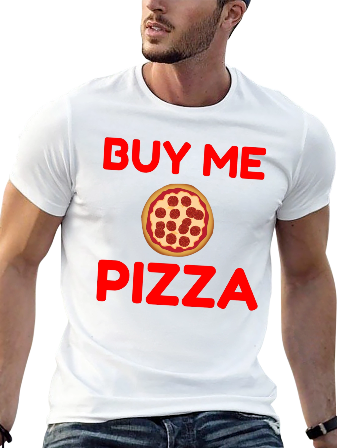 This black t-shirt features a playful design that's perfect for pizza lovers. The bold red text "BUY ME PIZZA" is separated by a delicious-looking pizza graphic. Made from what appears to be a soft and comfortable fabric, this tee offers a relaxed fit that's ideal for casual wear. It's a fun and expressive piece that can be worn for everyday activities, pizza nights with friends, or as a humorous statement piece. Showcase your love for pizza with this eye-catching and comfortable t-shirt!