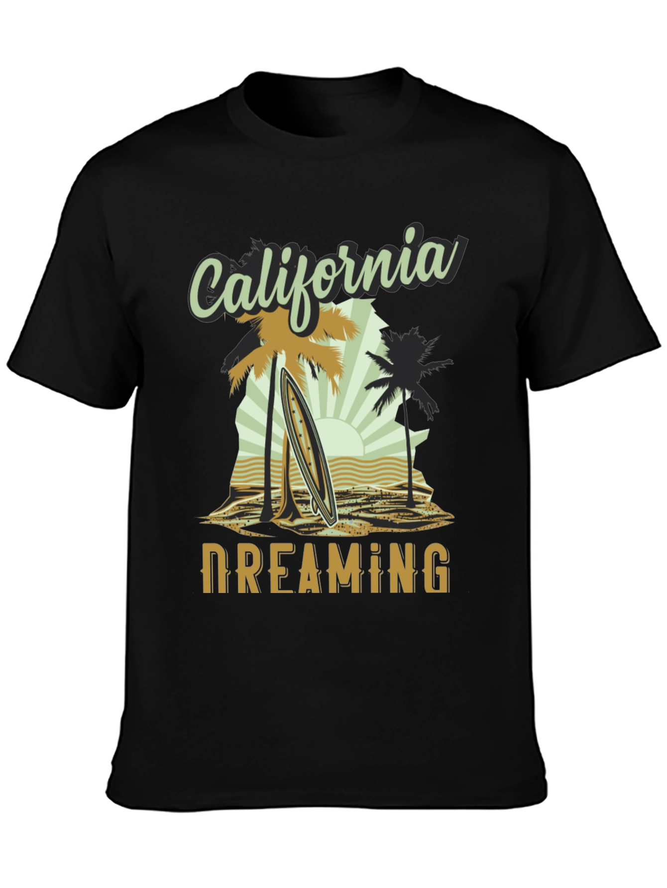 Embrace the California lifestyle with this stylish graphic tee. Featuring a vibrant design of palm trees, a surfboard, and a retro sun, this shirt captures the essence of beachside relaxation. The shirt reads "California Dreaming" across the design. Made from a comfortable, breathable fabric, it's perfect for everyday wear or your next beach getaway. Pair it with shorts or jeans for a casual, cool look. Stand out with this unique and eye-catching design that embodies the spirit of the Golden State. Get yours today and start dreaming of California!