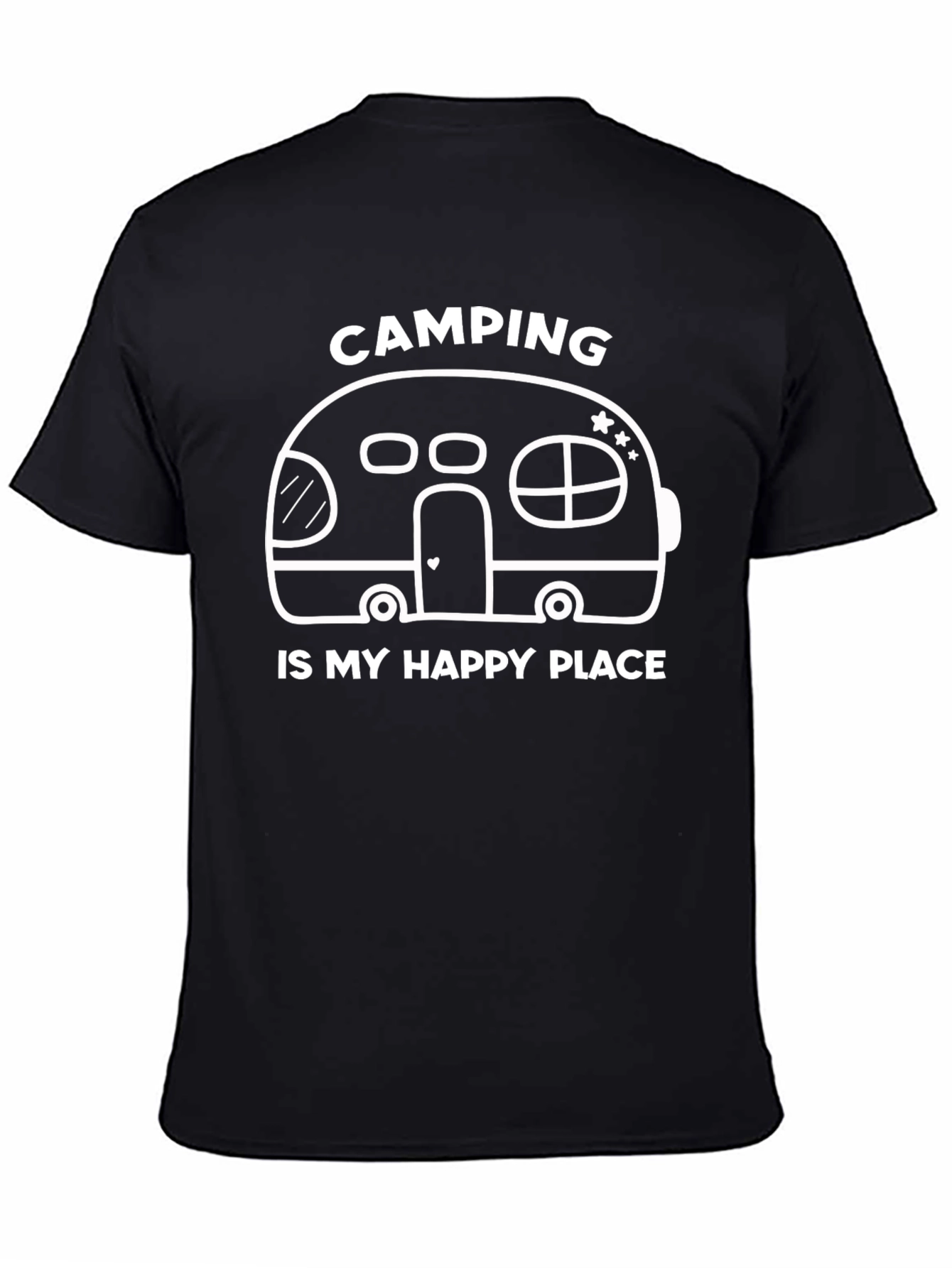 Embrace the outdoors with this stylish black graphic tee! Featuring a charming camper design, accompanied by the words "Camping IS MY HAPPY PLACE", this shirt is perfect for outdoor enthusiasts and adventure seekers. Crafted from soft, comfortable fabric, it's ideal for casual wear, camping trips, or simply expressing your love for nature. The clean, white graphics pop against the black background, making a bold statement. Show off your passion for camping with this unique and eye-catching t-shirt.