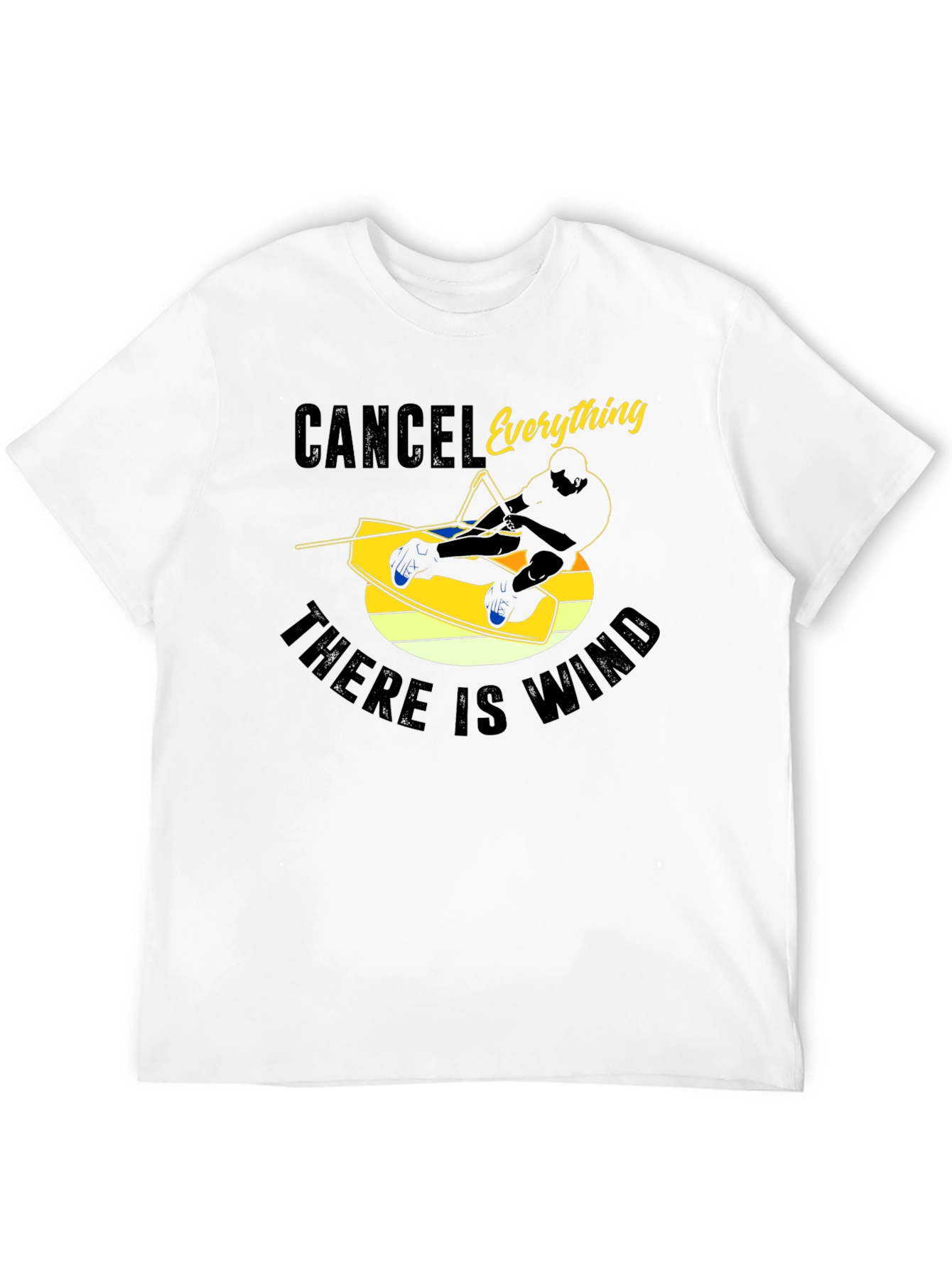 Embrace the thrill of wakeboarding with this stylish black t-shirt. Featuring a bold graphic design, this tee showcases a silhouette of a wakeboarder in action against a vibrant yellow backdrop reminiscent of a setting sun. The words "CANCEL Everything" are printed above the graphic, with "THERE IS WIND" below, perfect for outdoor lovers. Made from comfortable, breathable fabric, it's ideal for casual wear, trips to the lake, or simply expressing your passion for watersports. This t-shirt is a statement piece that captures the spirit of adventure.