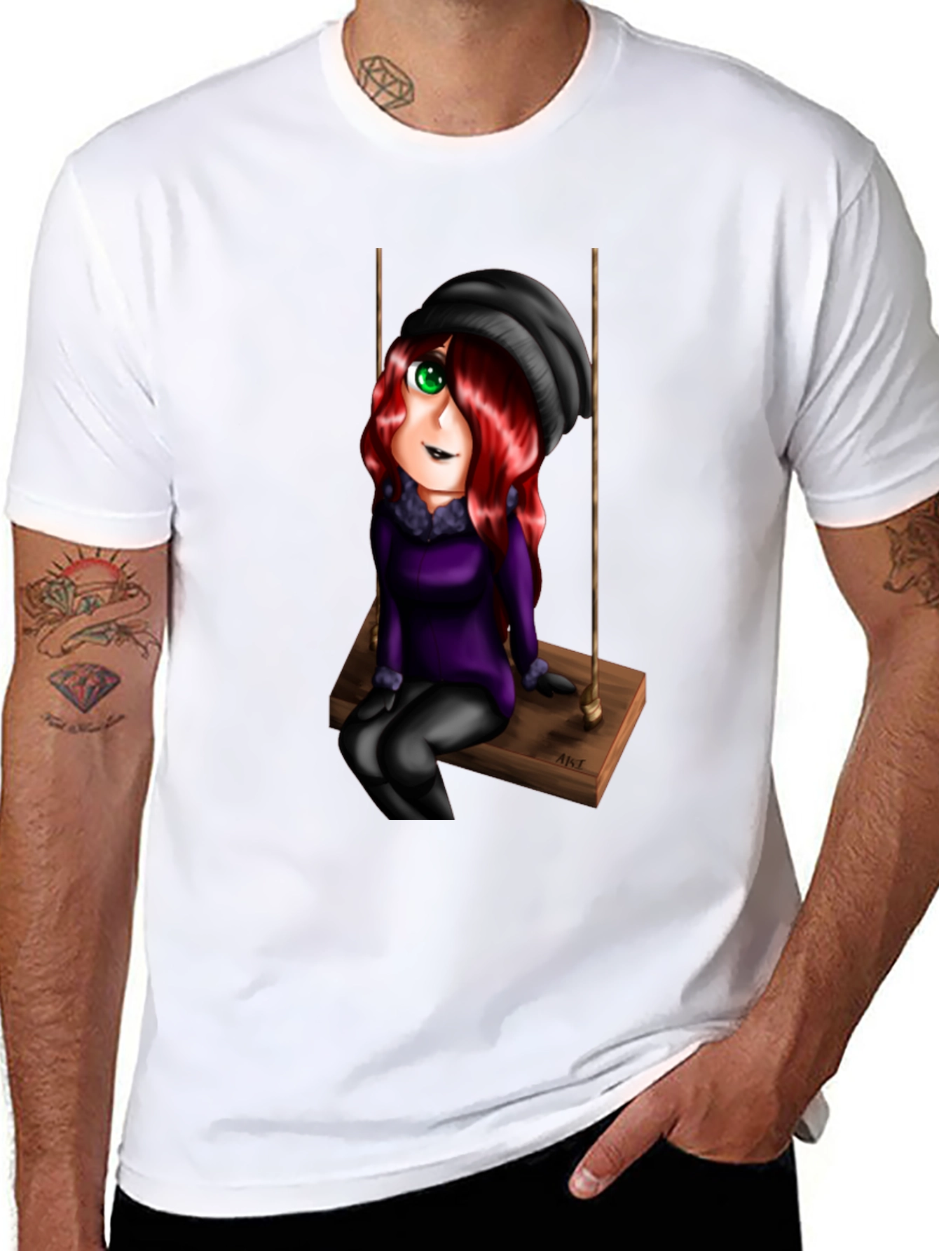 Elevate your casual wardrobe with this unique graphic t-shirt. Featuring a vibrant cartoon illustration of a girl sitting on a wooden swing, this shirt is sure to turn heads. The design includes a charming character with red hair, green eyes, and a cozy black beanie, all set against the backdrop of a simple, elegant swing. Made from a comfortable, breathable black fabric, this t-shirt is perfect for everyday wear. Pair it with jeans for a relaxed look, or dress it up with a jacket for a night out. A must-have for anyone who loves whimsical and artistic designs.