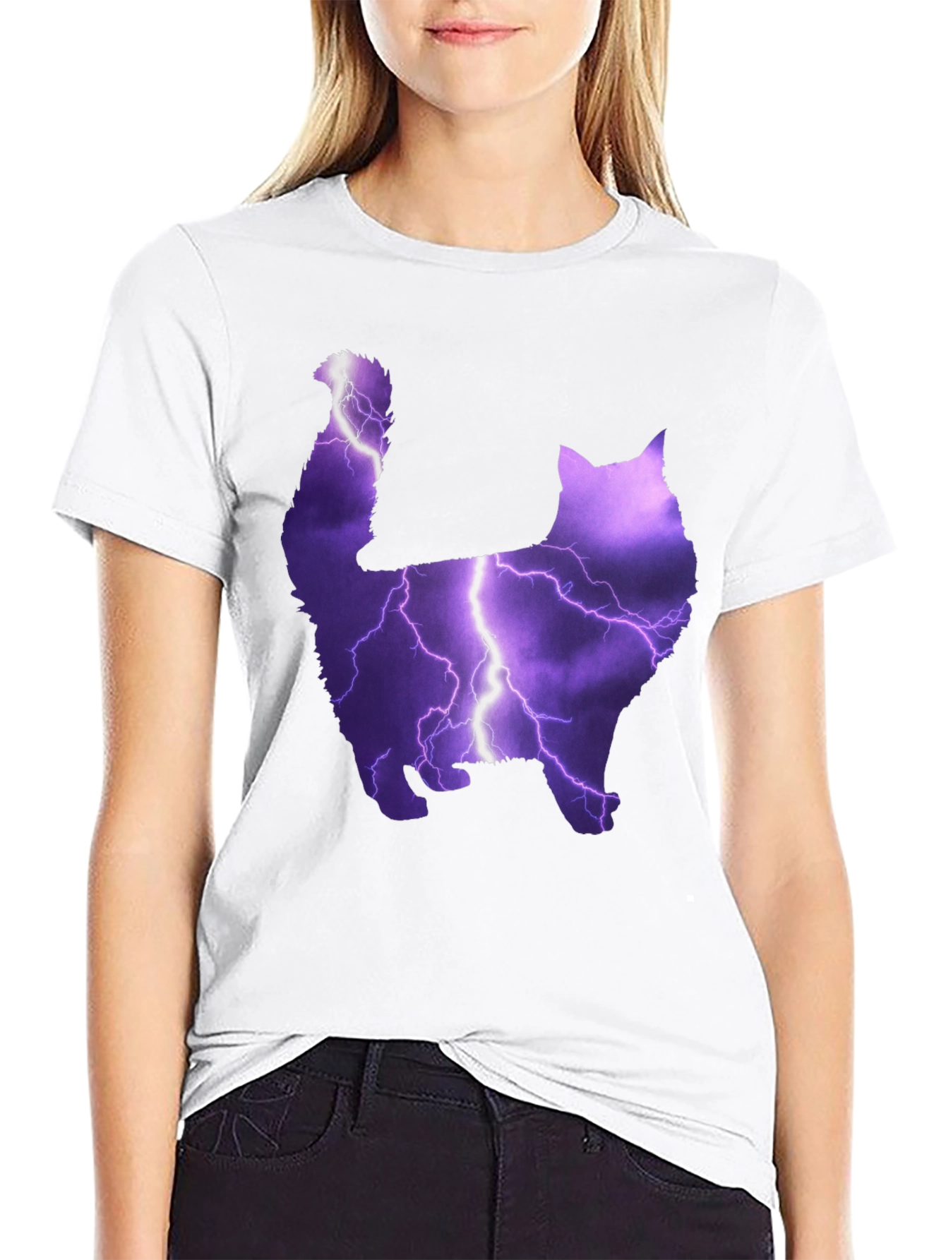 Show off your love for cats and storms with this striking graphic t-shirt! This black tee features a unique silhouette of a cat filled with vibrant purple lightning bolts. The design is eye-catching and sure to spark conversations. Made from a comfortable fabric blend, this short-sleeve shirt is perfect for everyday wear. Whether you're lounging at home, running errands, or meeting friends, this tee will keep you looking stylish and feeling great. A great addition to any casual wardrobe, or a gift for the cat lover in your life!