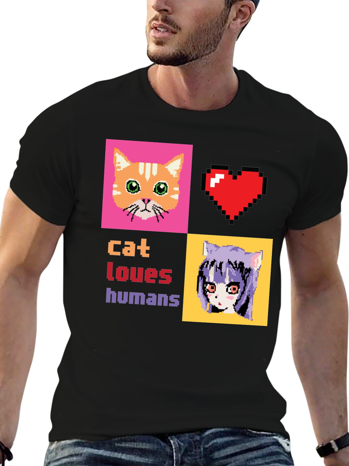 Express your affection for feline friends with this unique 'Cat Loves Humans' T-shirt. The shirt features a playful pixel art design including a cute cat, a heart, and an anime-style character. The design is eye-catching against the shirt's dark backdrop. Made from what appears to be soft, breathable fabric, this tee promises all-day comfort and lasting wear. Perfect for casual outings, lounging at home, or as a conversation starter, this shirt is a must-have for cat lovers and pixel art enthusiasts alike. Show off your quirky side with this fun and comfortable tee!