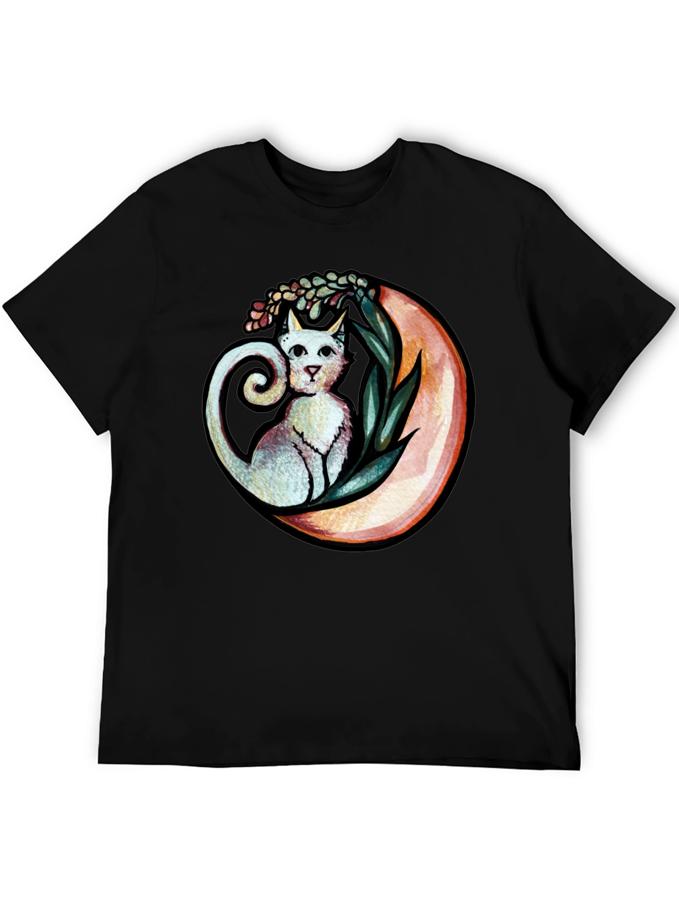 Embrace celestial charm with this black graphic tee featuring a watercolor-style cat resting on a crescent moon. The design includes delicate foliage and a curled tail, creating a whimsical and artistic vibe. Made from comfortable material, this t-shirt is perfect for casual wear, making a statement at a gathering, or simply expressing your love for cats and unique art. Stand out with its eye-catching design and enjoy the soft, breathable fabric. A must-have for any wardrobe!