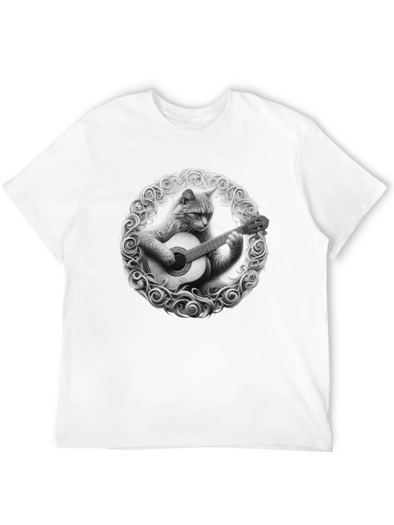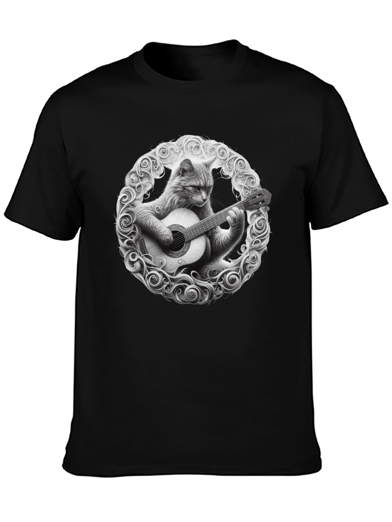 Show off your love for music and feline charm with this unique black t-shirt. The striking graphic features a detailed illustration of a cat skillfully playing a guitar, framed by an ornate, swirling design. Crafted from a soft, comfortable fabric, this tee offers both style and comfort. The versatile design makes it perfect for casual outings, music events, or simply lounging at home. Make a statement with this conversation-starting piece that blends artistry and lightheartedness. Available in various sizes to ensure the perfect fit.