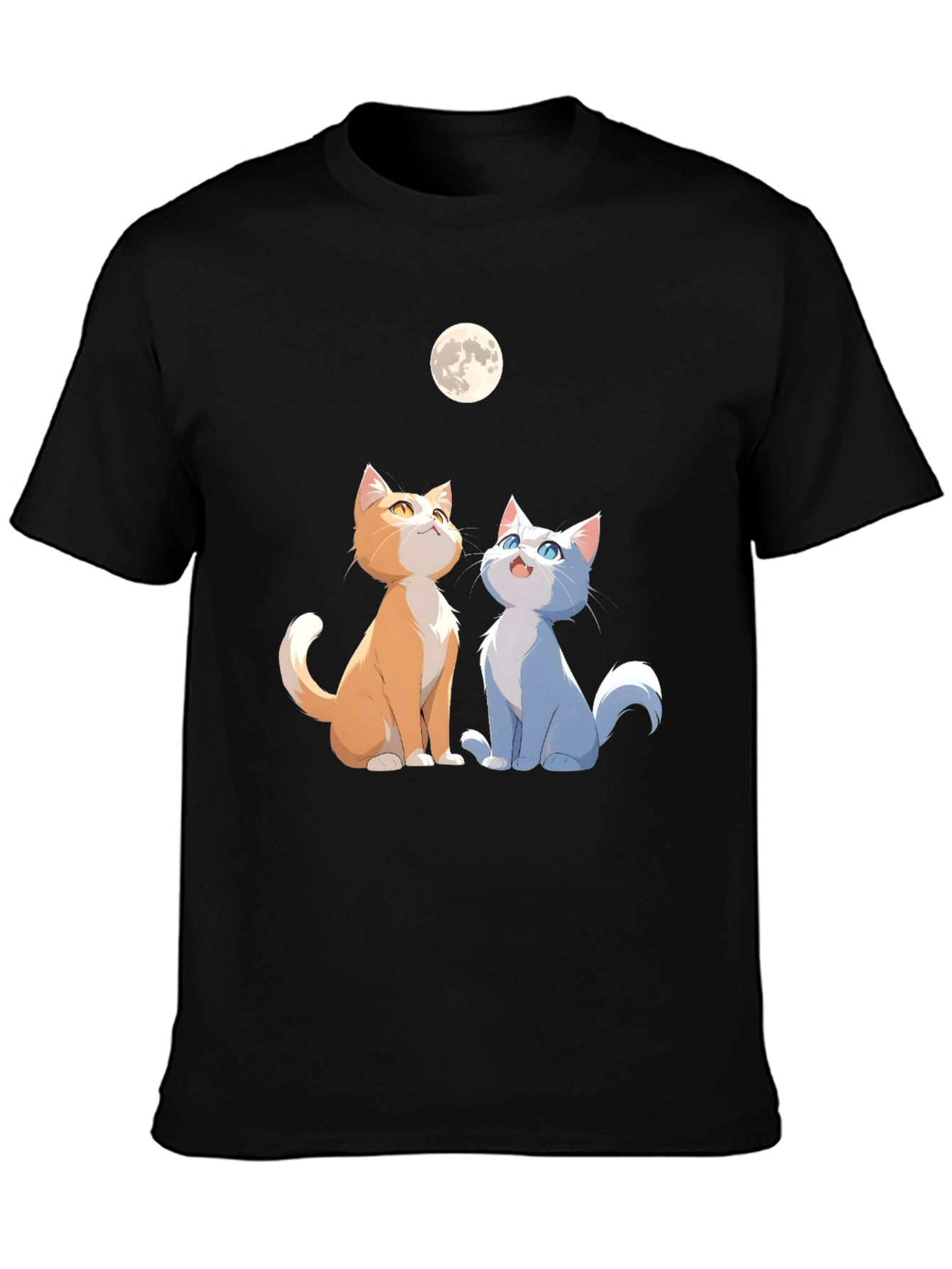 This stylish black t-shirt features an adorable cartoon illustration of two cats gazing up at a bright full moon. The design showcases one orange tabby cat and one light blue cat, both with expressive eyes. Made from a comfortable-looking fabric, this unisex tee is perfect for everyday wear. The high-quality print ensures the design remains vibrant wash after wash. Ideal for cat lovers or anyone who enjoys unique and playful apparel. Dress it up or down, this versatile tee adds a touch of whimsy to any outfit.