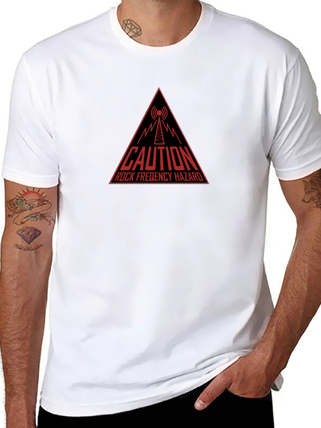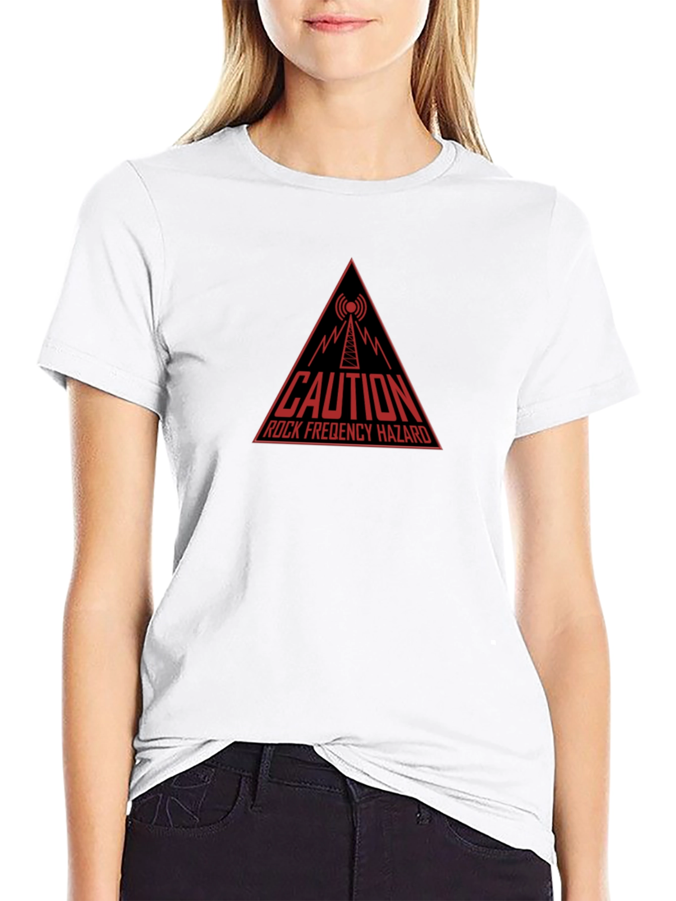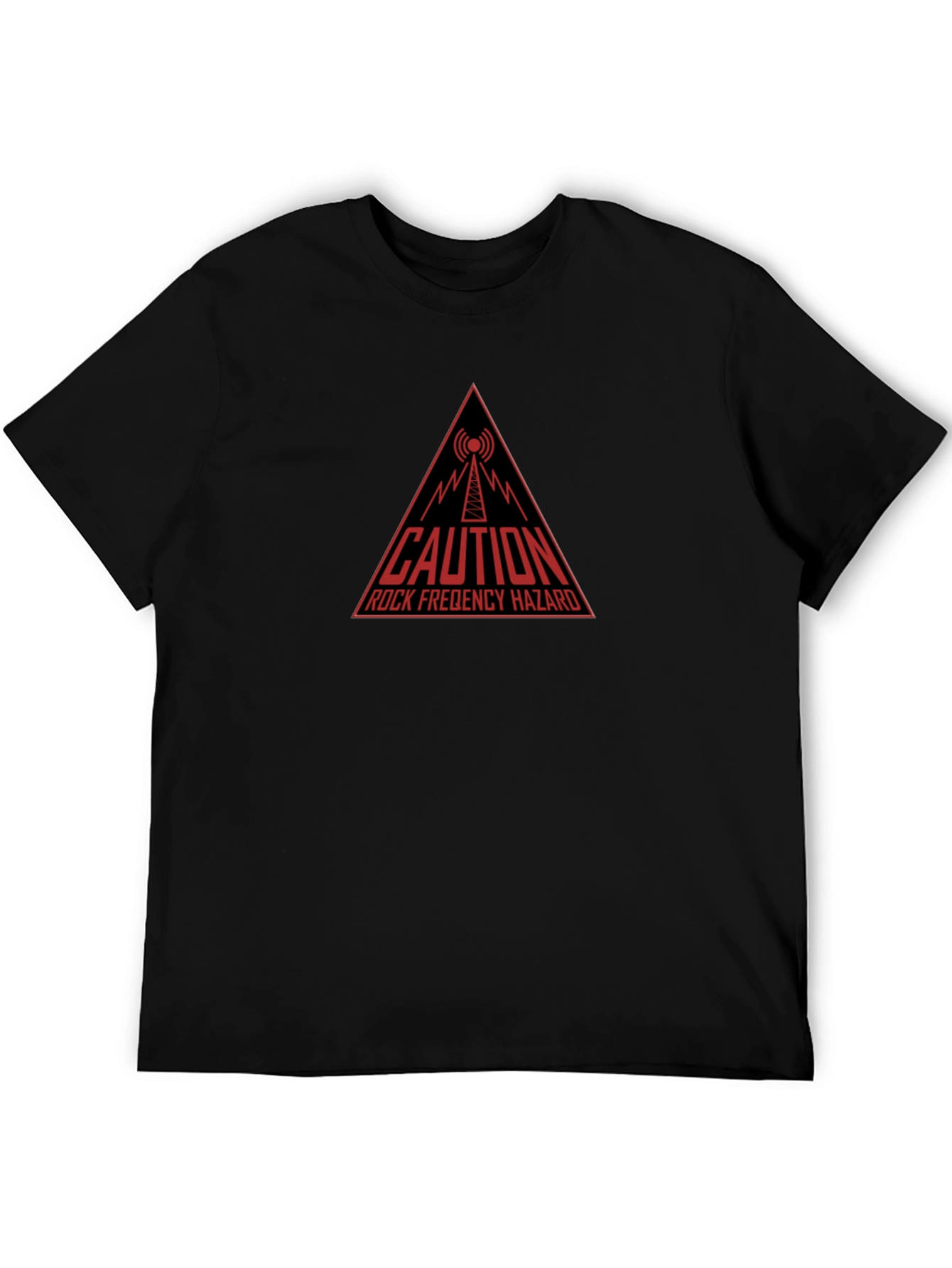 Show off your edgy style with this unique graphic tee! The shirt features a bold, red, triangular "Caution Rock Frequency Hazard" design, complete with a stylized radio tower. Made from comfortable, breathable fabric, this short-sleeved tee is perfect for casual wear. The dark color creates a striking contrast, making the graphic pop. Ideal for music lovers, tech enthusiasts, or anyone who wants to add a touch of humor to their wardrobe. Pair it with jeans or shorts for a cool, relaxed look. Grab yours today and make a statement!