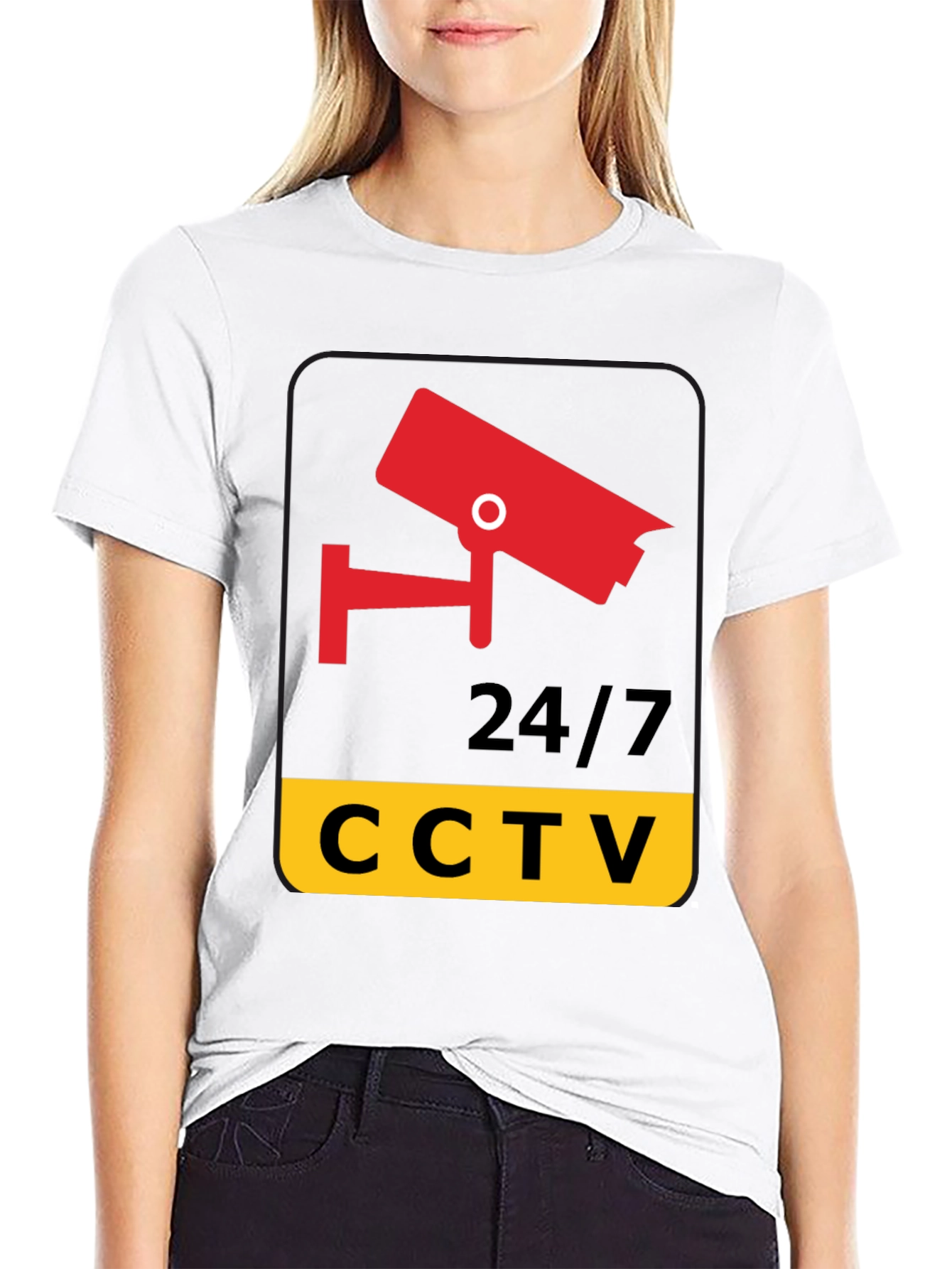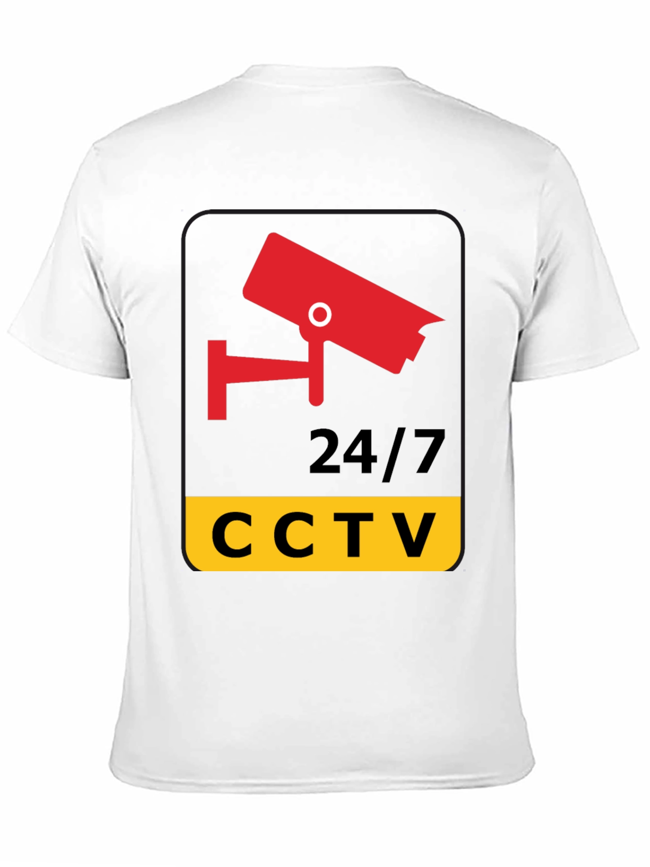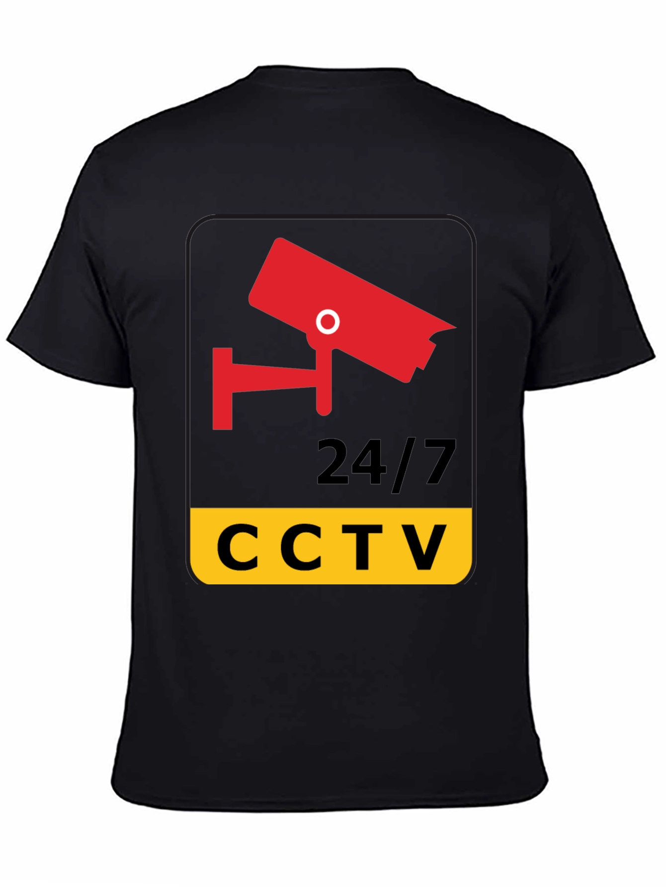 Stay secure and stylish with this unique CCTV graphic tee. Made from comfortable, breathable fabric, this black t-shirt features a bold, eye-catching design. A red security camera graphic tops the 24/7 CCTV text on a yellow background. Ideal for security professionals, tech enthusiasts, or anyone who wants to make a statement. Perfect for casual wear, events, or as a conversation starter. Stand out from the crowd and show your commitment to safety and security with this distinctive t-shirt.