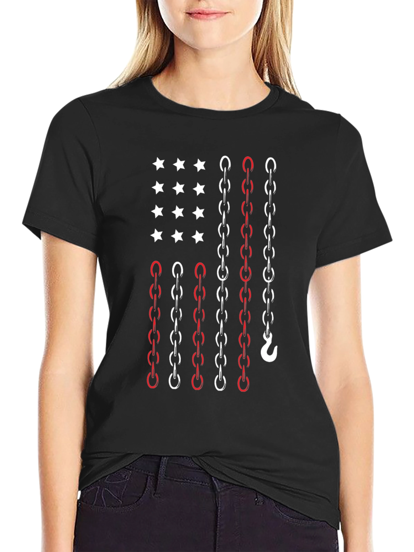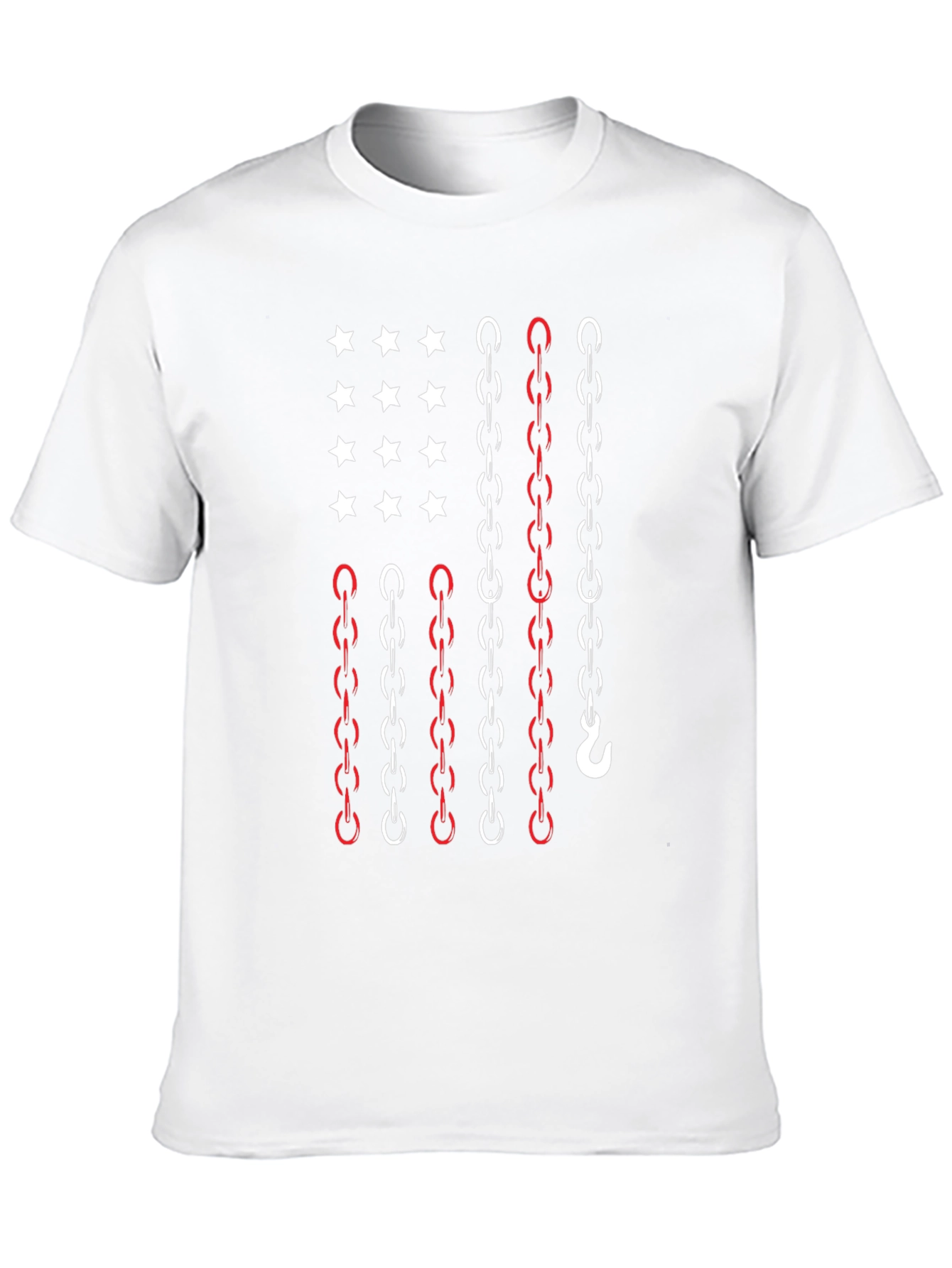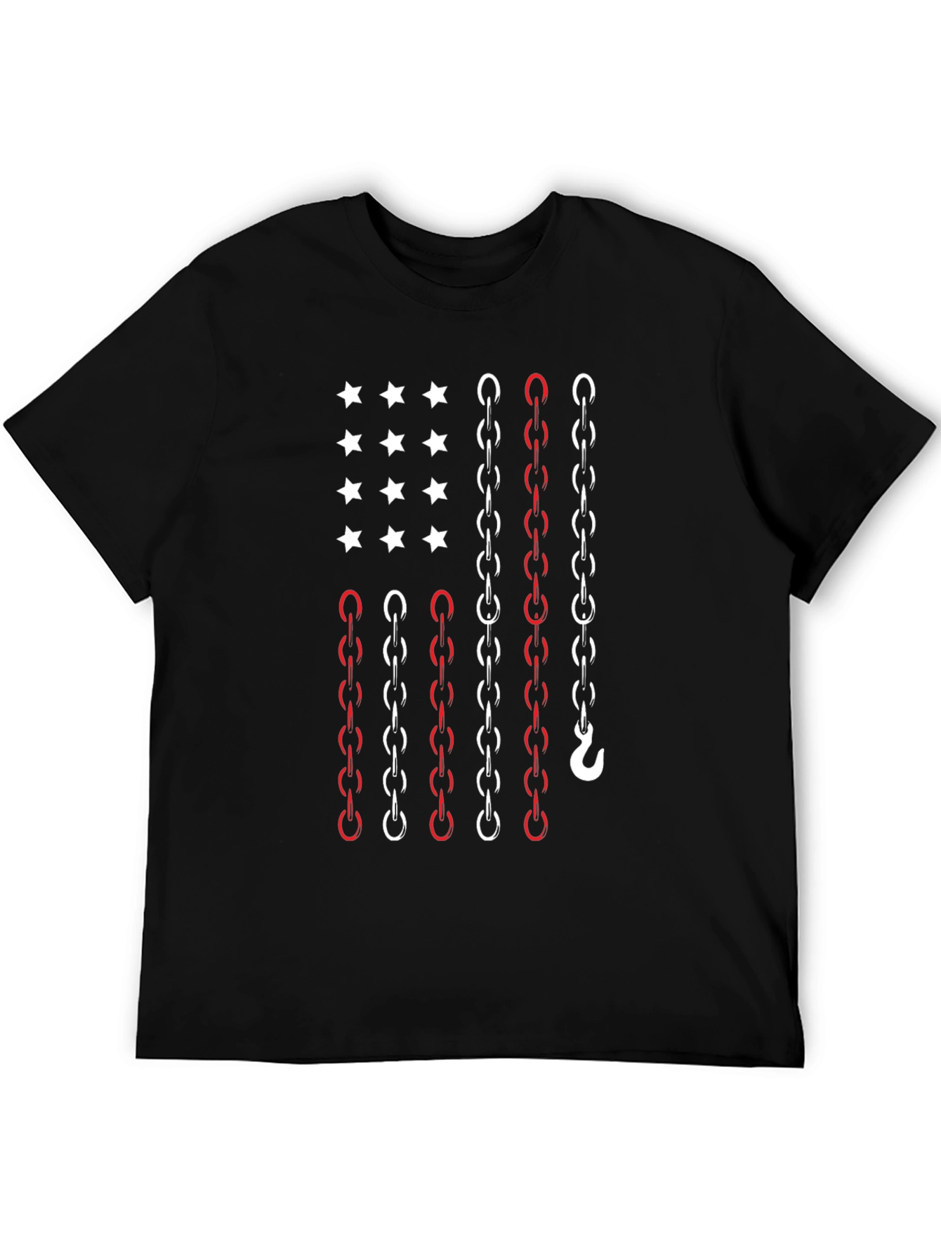 Show your American pride with this unique chain-themed flag graphic tee. The black t-shirt features a stylized US flag design composed of white stars and red and white chains, creating a bold and eye-catching visual. Made from a comfortable, breathable fabric, this tee is perfect for everyday wear. The design incorporates a hook detail on one of the chains, adding a subtle industrial touch. Ideal for casual outings, patriotic events, or as a gift for someone who loves unique Americana-themed apparel, this t-shirt offers a blend of comfort and distinctive style. A modern twist on classic patriotism!