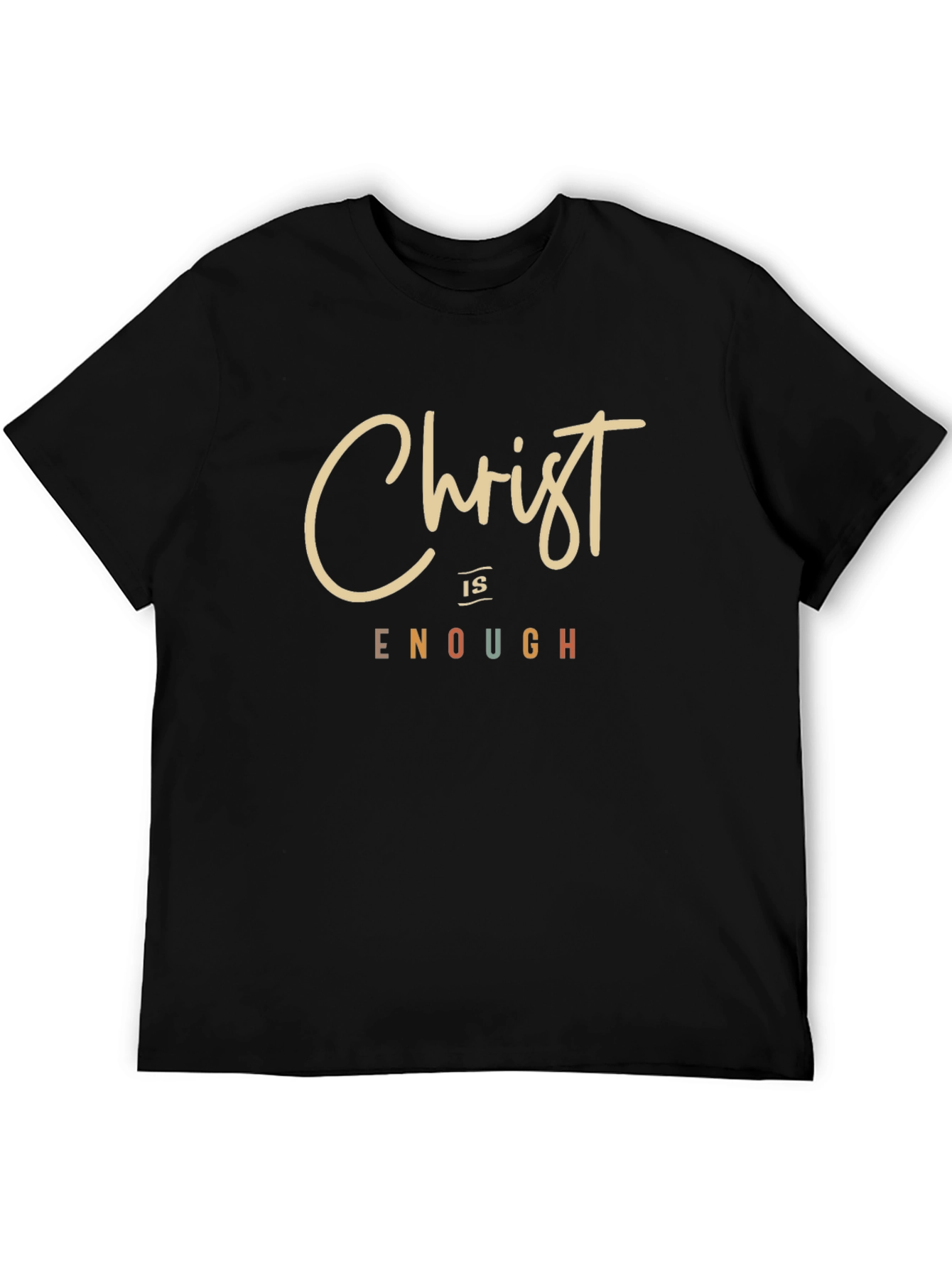 This stylish black t-shirt features a bold "Christ is Enough" graphic print on the front. The word "Christ" is displayed in an elegant, cursive beige font, while "is" is smaller and underlined. "Enough" appears in block letters with individual letters in contrasting red, green, brown, and beige. The shirt is made from a soft-looking fabric, perfect for everyday wear. The classic crew neck and short sleeves offer a comfortable fit. Ideal for expressing your faith and making a statement, this tee is a versatile addition to any wardrobe. Great for casual outings, church events, or as a thoughtful gift.