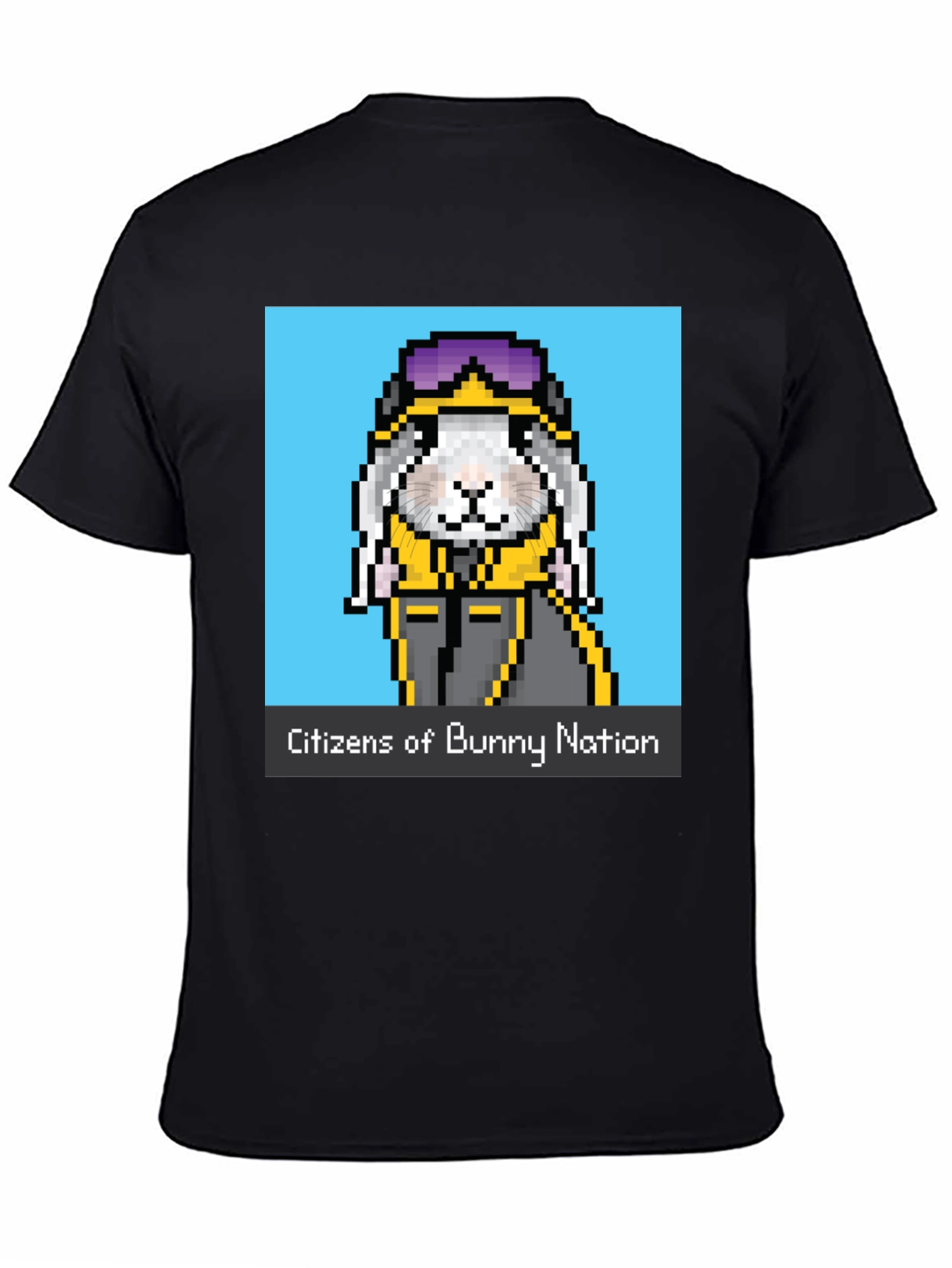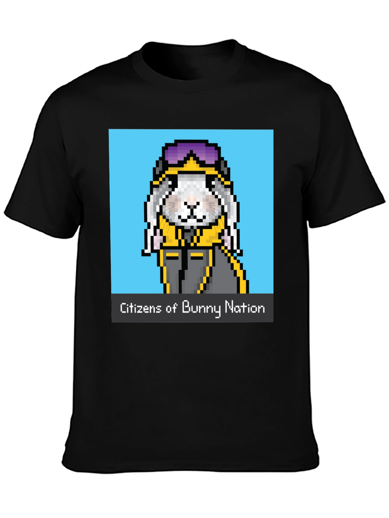 Show off your unique style with this eye-catching graphic tee. The shirt features a pixelated image of a bunny wearing a crown against a blue background. The design is emblazoned with the text 'Citizens of Bunny Nation' adding a touch of playful sophistication. Made from a comfortable material, this black tee is perfect for casual wear. The bold graphic makes it a great conversation starter, ideal for social gatherings, or everyday adventures. This t-shirt offers both comfort and unique style, making it a must-have for those who appreciate eye-catching designs.