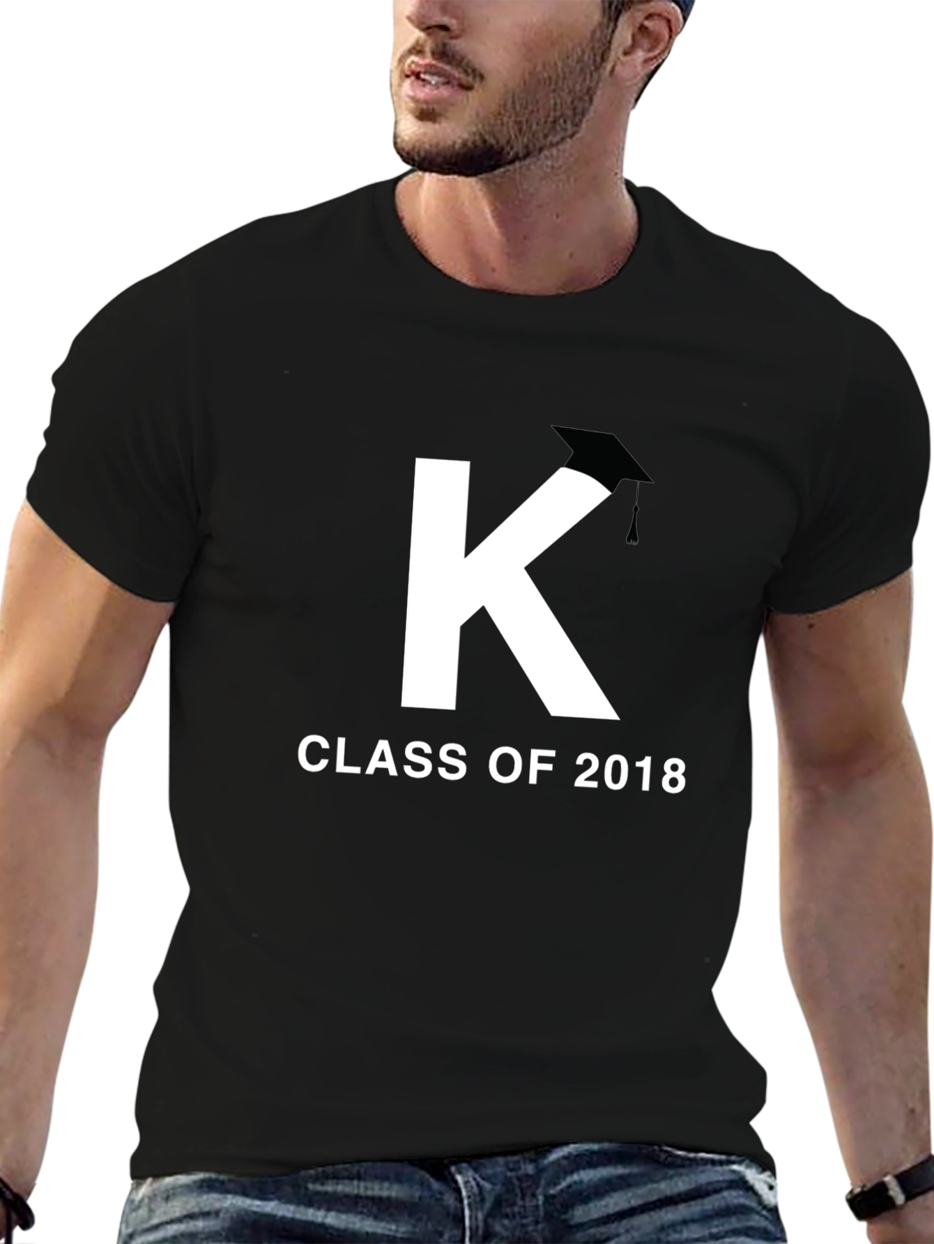 Celebrate graduation year with this classic black t-shirt. The design features a bold white "K" topped with a graduation cap graphic, making it a unique and personalized graduation tee. Below the "K" is the inscription "CLASS OF 2018" in white. Made from comfortable materials, this tee is perfect for graduation parties, alumni events, or everyday wear to show off your school pride. Makes a great gift for any graduate from the Class of 2018. Stand out and remember this milestone year with this special edition t-shirt.