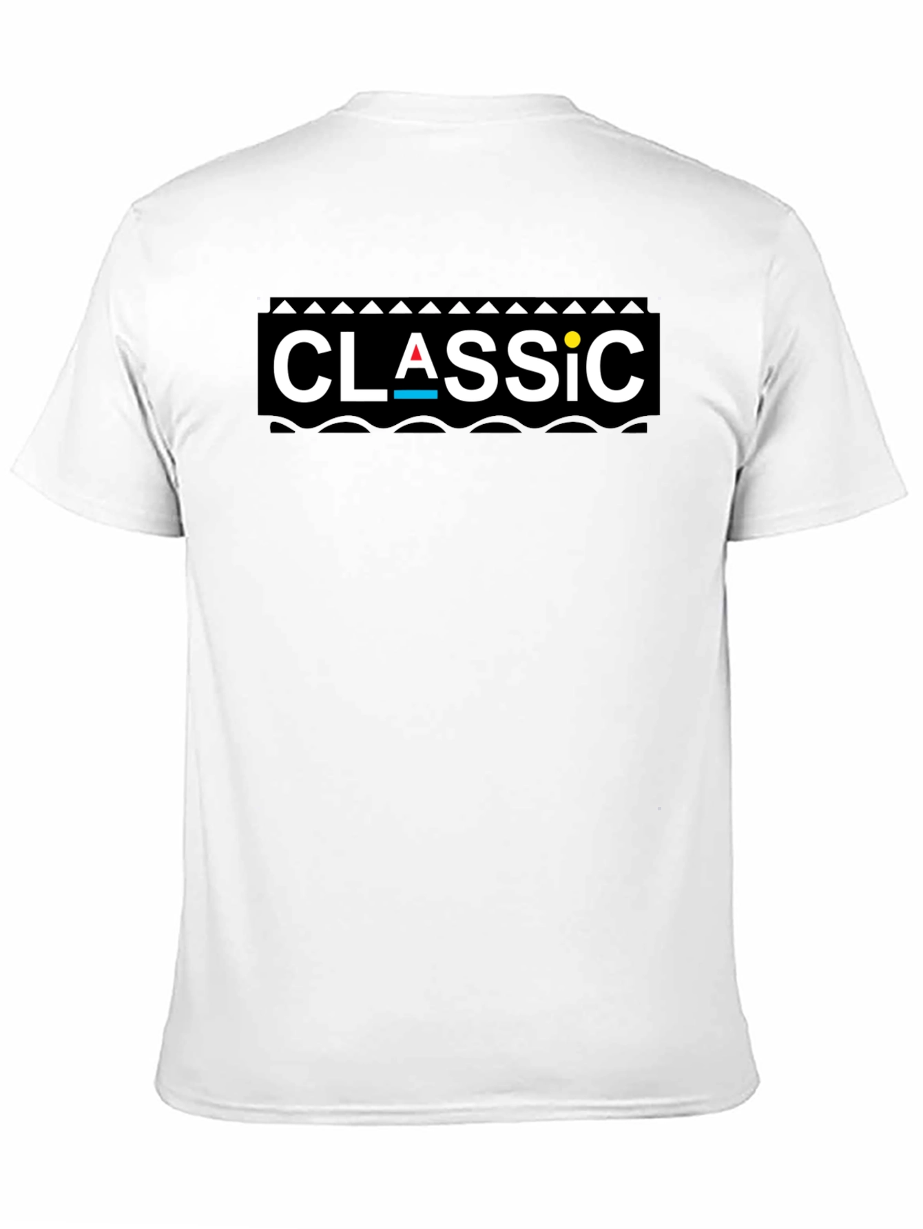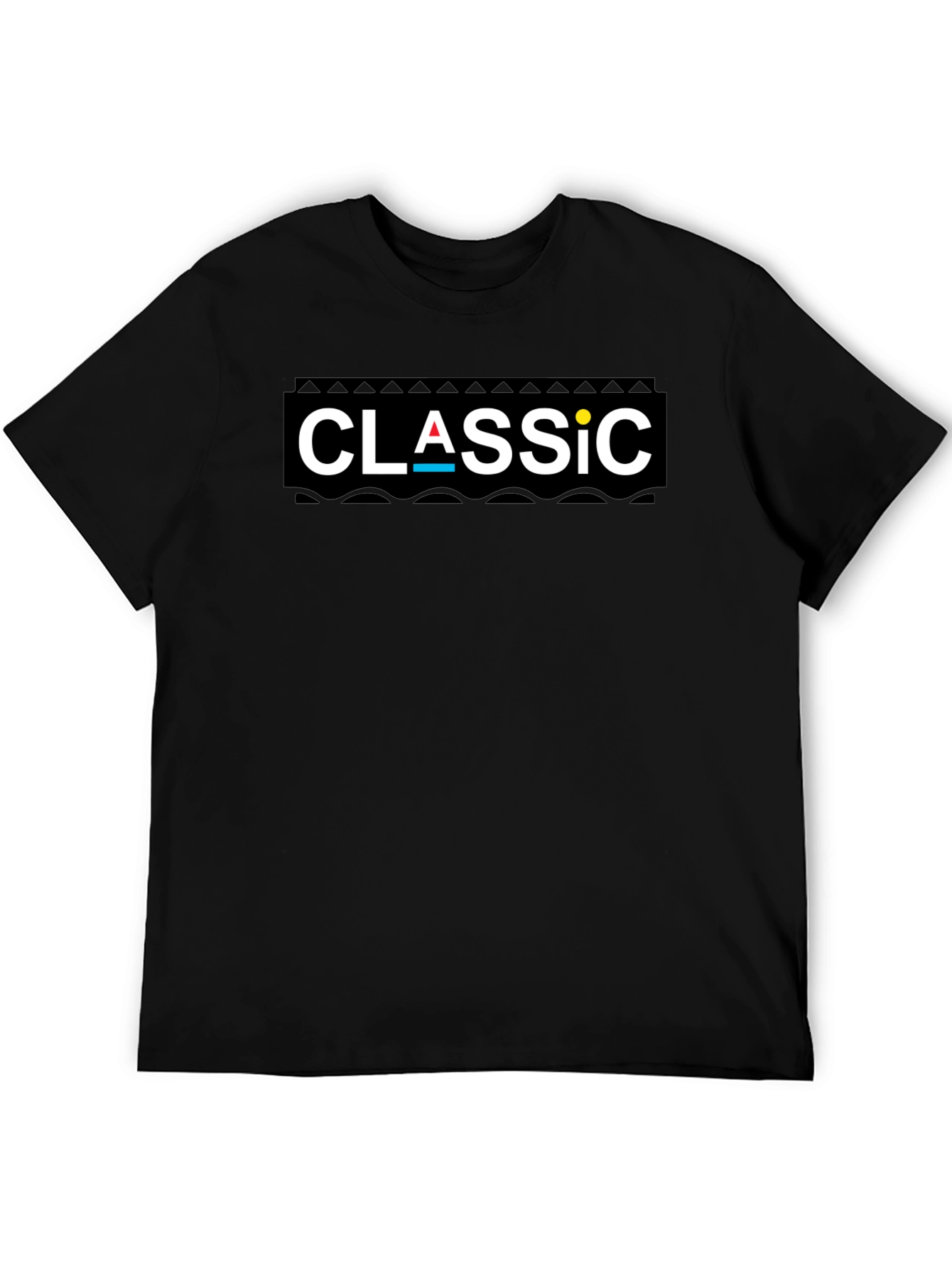 Elevate your casual style with this sleek black graphic tee. The shirt features a bold, eye-catching 'CLASSIC' print in a modern, minimalist design. The graphic includes a unique combination of shapes and colors that add a stylish and playful touch. Made from a soft and comfortable material, this tee is perfect for everyday wear. Pair it with jeans or shorts for a laid-back look, or dress it up with a blazer for a more refined style. Its versatile design makes it a great addition to any wardrobe. Perfect for casual outings, weekend adventures, or just lounging at home, this tee is a must-have for those who appreciate stylish simplicity and a comfortable fit.
