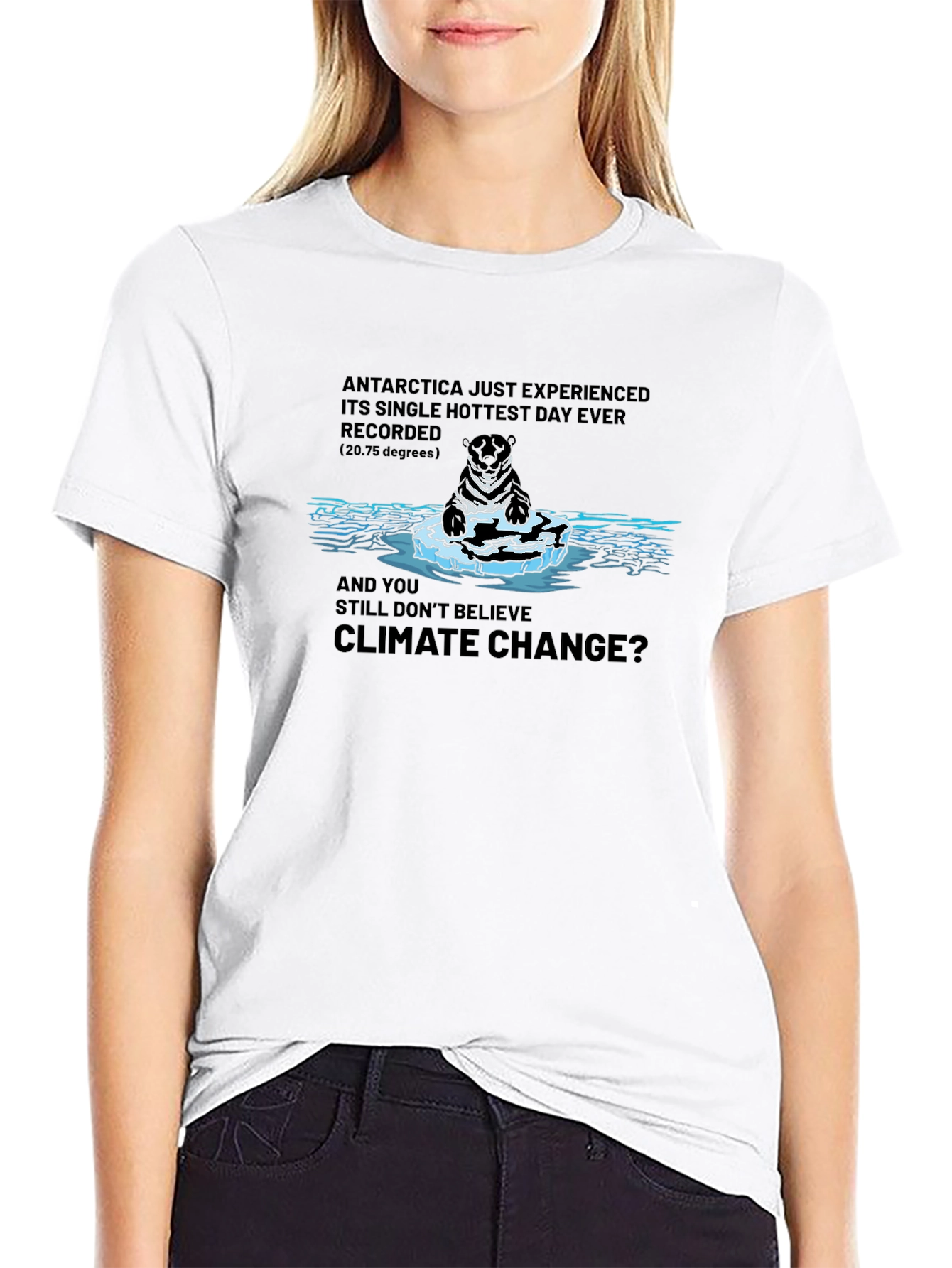 Make a statement with this black t-shirt featuring a powerful message about climate change. The design shows a polar bear stranded on a melting iceberg with the text: "Antarctica just experienced its single hottest day ever recorded (20.75 degrees) AND YOU still don't believe climate change?". Crafted from a comfortable, breathable fabric, this tee is perfect for everyday wear. Wear it to spark conversations and raise awareness about the urgent need for environmental action. Show your commitment to a sustainable future with this unique and impactful t-shirt.