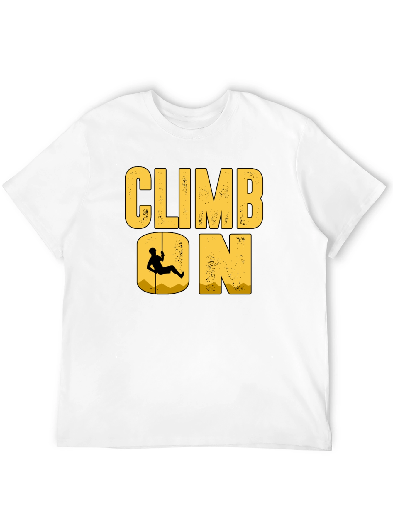 Show off your love for climbing with this stylish black t-shirt! The bold design features the words "CLIMB ON" in a distressed yellow font, with a climber silhouette integrated into the lettering. Made from a comfortable fabric blend, this tee is perfect for everyday wear or as a statement piece at the climbing gym. Whether you're an experienced climber or just a fan of the sport, this t-shirt lets you express your passion with confidence and style. Get yours now and inspire others to join the adventure!