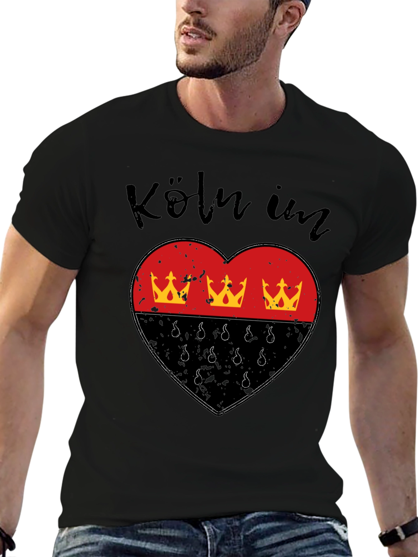 Show your love for Cologne with this unique black t-shirt. The shirt features a bold graphic of a heart, colored with the iconic red and black of the city's flag. Three gold crowns adorn the red section, while eleven black 'tears' decorate the black half. The design is printed with a slightly distressed effect, giving it a vintage, worn-in feel. Above the heart, the city's name 'Köln' is written in a stylish script. Perfect for tourists, locals, or anyone who loves Cologne, Germany. A stylish way to express your pride.