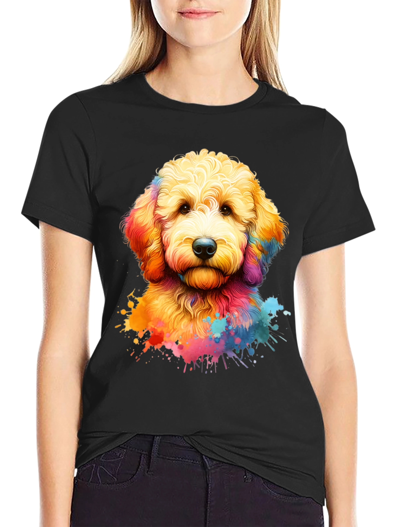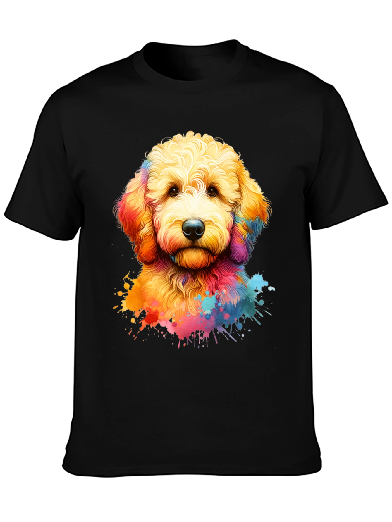 Show your love for dogs with this stylish black t-shirt. Featuring a vibrant, colorful graphic of a fluffy dog, possibly a Goldendoodle, with watercolor splash effects, this tee is sure to turn heads. The vivid colors and unique design make it a standout piece for casual wear. Made from a comfortable, breathable fabric, this shirt is perfect for everyday activities, dog walks, or simply lounging around. Get yours today and make a statement!
