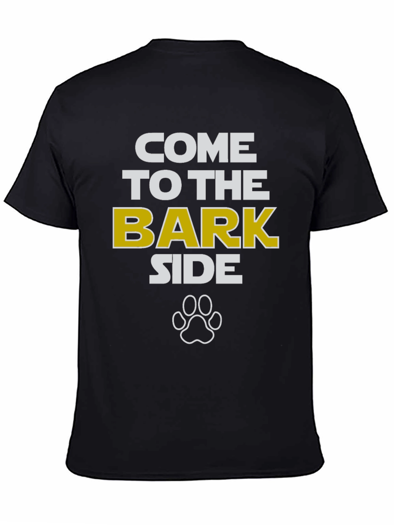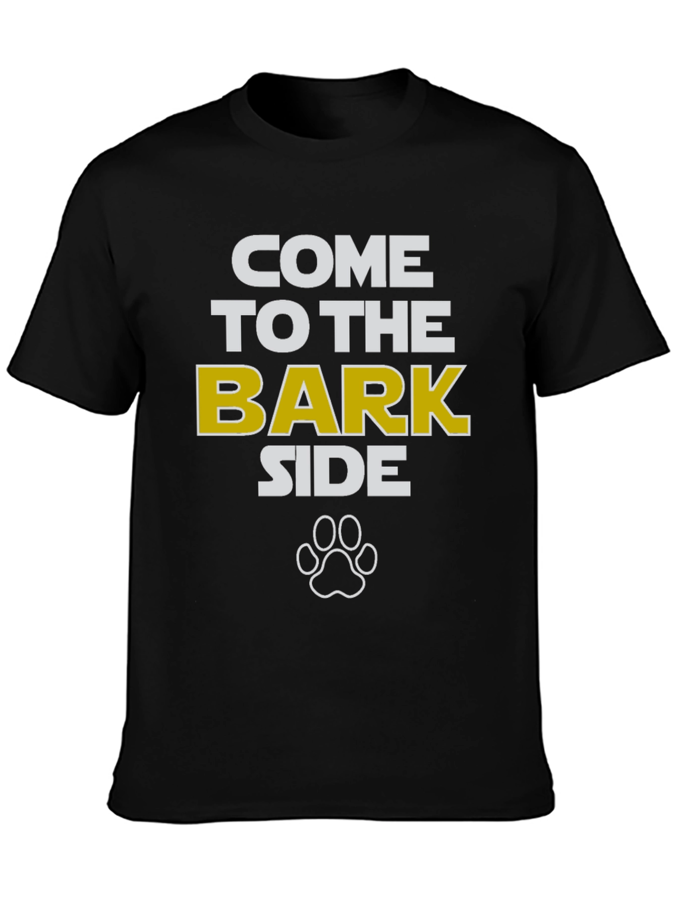 Show your love for dogs with this stylish black t-shirt. Featuring the humorous phrase "Come to the Bark Side" in bold white and gold letters, complete with a paw print graphic. This shirt is perfect for casual wear, dog park visits, or as a gift for any dog enthusiast. Made from a comfortable-looking fabric, it's ideal for everyday wear. Let everyone know where your loyalties lie with this fun and eye-catching tee.