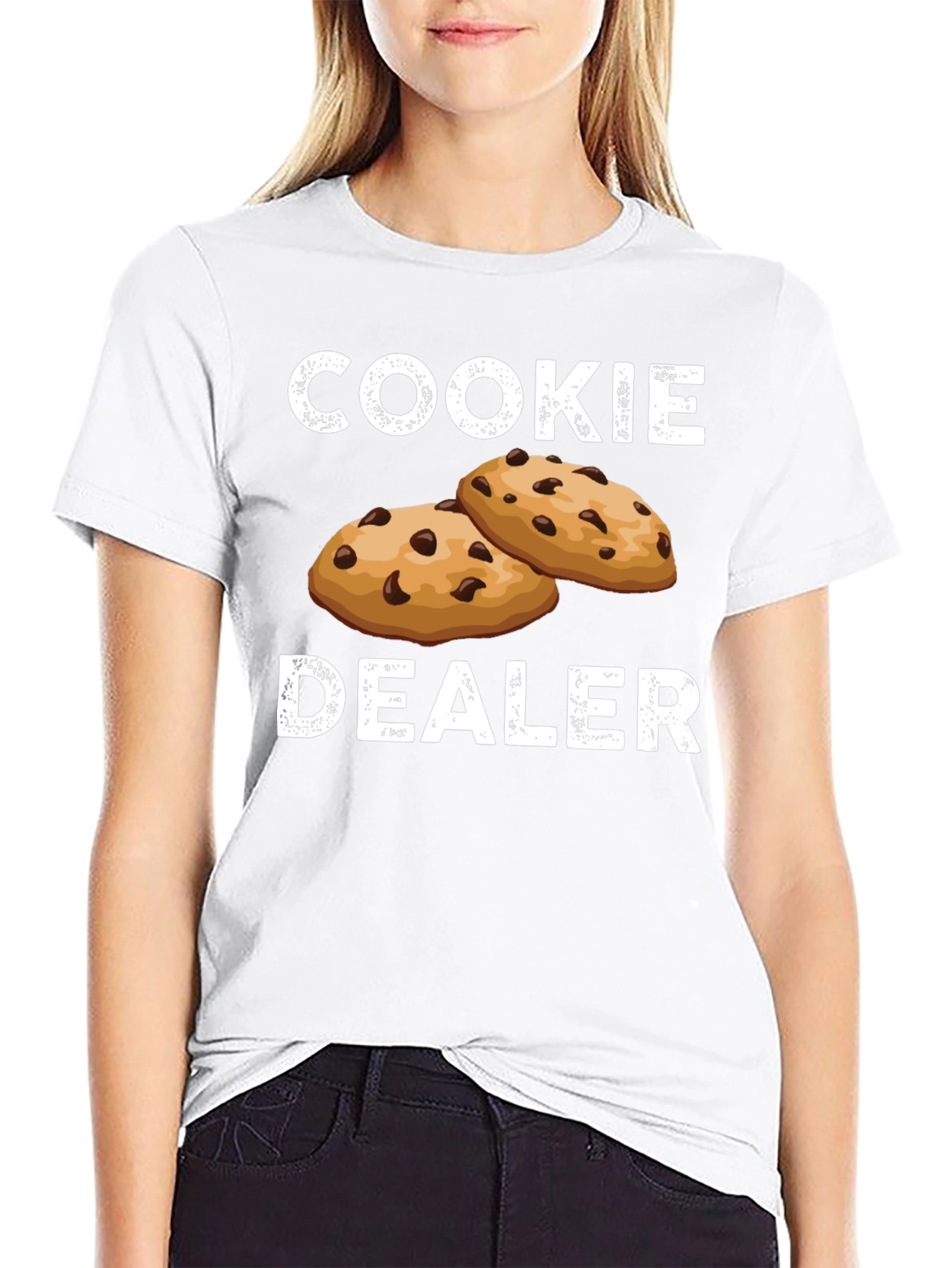 This stylish black t-shirt features a playful "Cookie Dealer" design, complete with illustrations of delicious chocolate chip cookies. Made from a comfortable-looking fabric, this tee is perfect for anyone with a sweet tooth or a love for baking. The design is crisp and eye-catching, making it a fun conversation starter. Wear it casually around town, to a baking event, or while simply relaxing at home. It's a unique and humorous addition to any wardrobe. Show off your cookie enthusiasm with this must-have t-shirt!