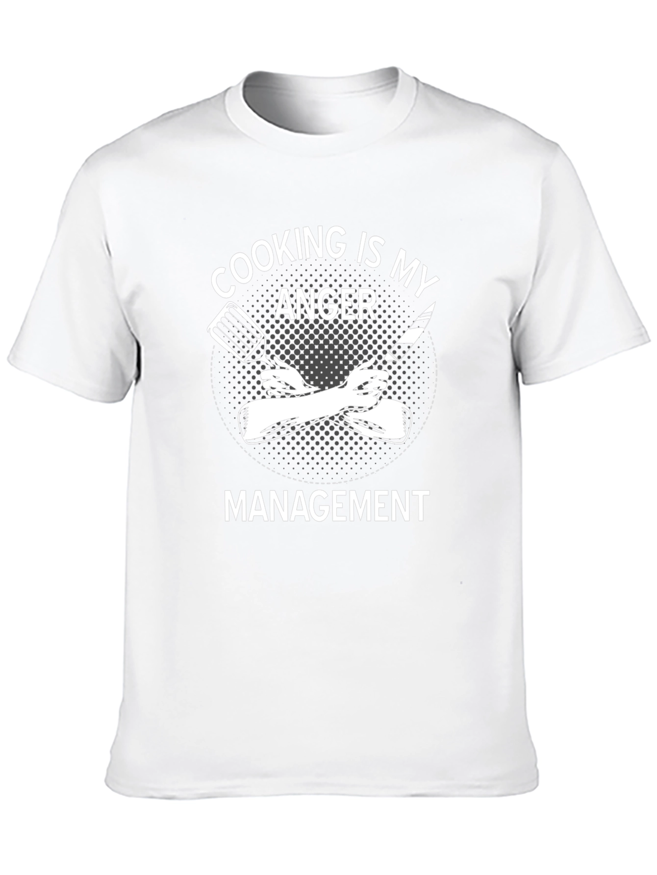 This black t-shirt features a humorous and relatable message for cooking enthusiasts. The design showcases the phrase "COOKING IS MY ANGER MANAGEMENT" in bold, white lettering, accompanied by a stylized graphic of crossed arms holding a spatula and a knife. This tee is perfect for chefs, home cooks, and anyone who finds solace in the kitchen. Made from comfortable material, it's ideal for casual wear, cooking sessions, or as a fun gift for the culinary-inclined. Let everyone know your secret to staying calm is whipping up something delicious!