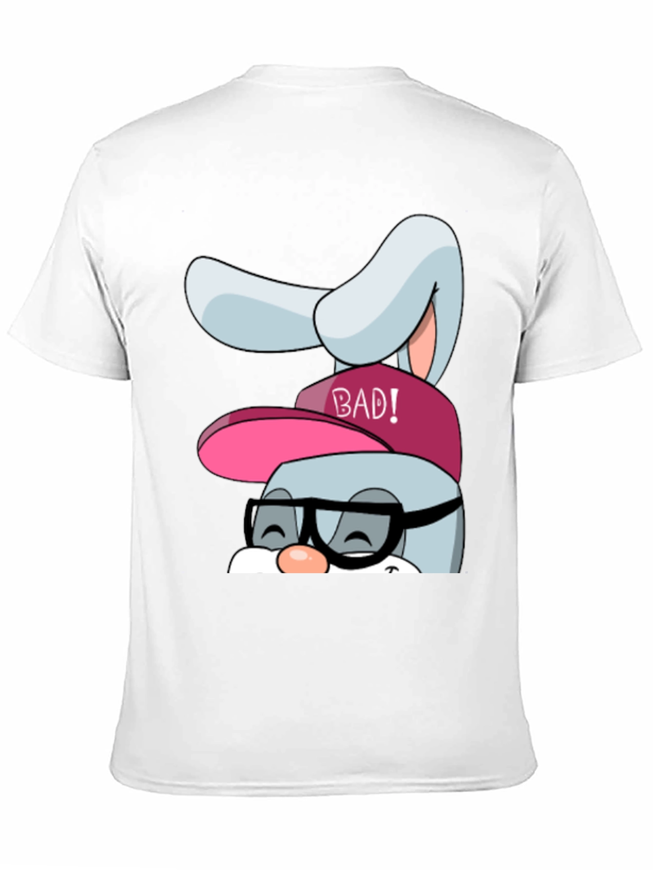 Show off your fun side with this unique graphic tee! This black t-shirt features a playful cartoon bunny wearing a pink "BAD!" baseball cap and stylish glasses. The whimsical design adds a touch of personality to your casual wear. Made from comfortable, breathable fabric, this tee is perfect for everyday wear, casual outings, or just lounging around. Pair it with jeans, shorts, or your favorite bottoms for a trendy look. Add this eye-catching tee to your wardrobe and express your unique style!
