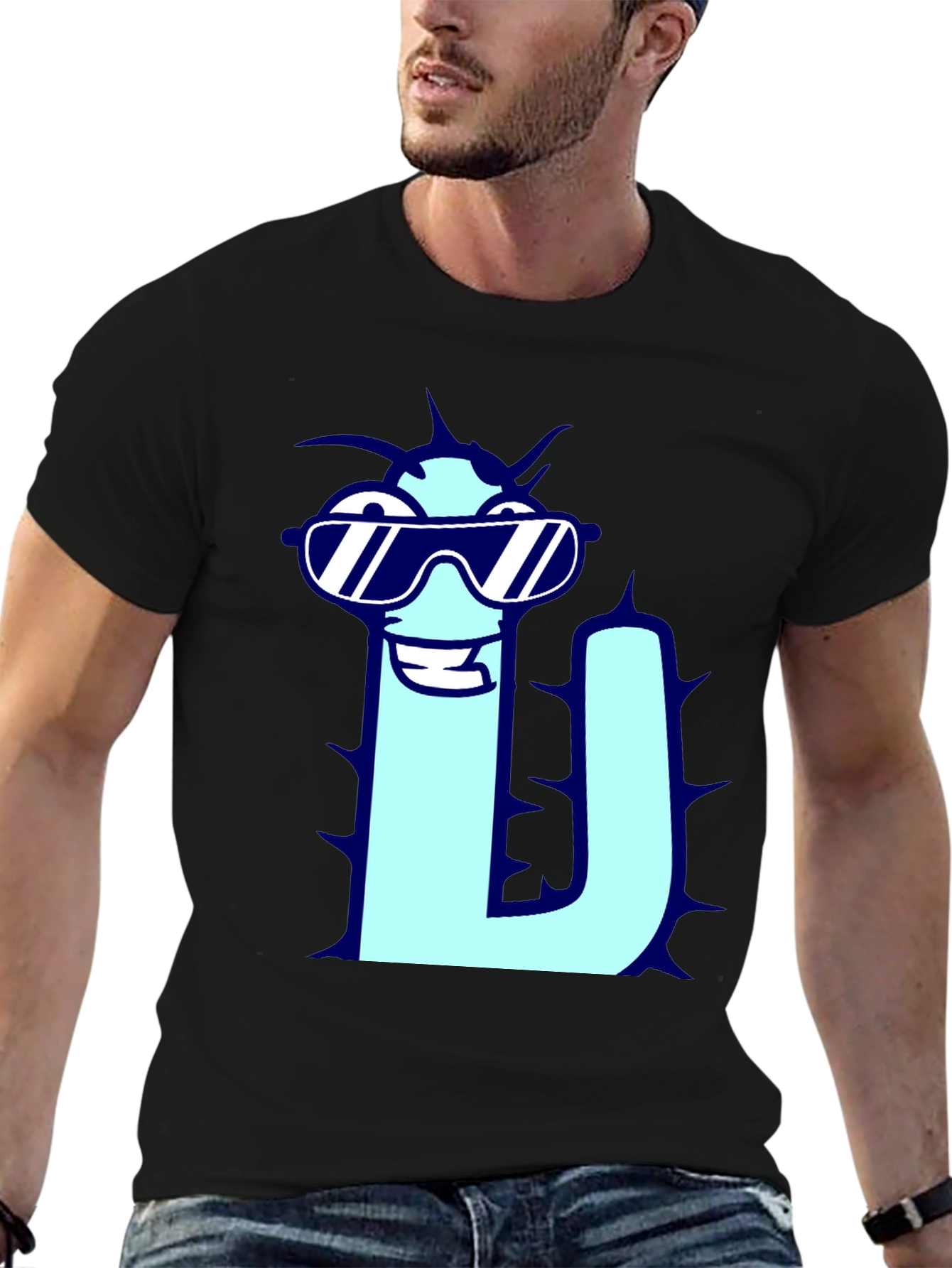 Show off your fun side with this eye-catching black t-shirt! Featuring a quirky cartoon cactus design, complete with cool sunglasses and a playful smile, this tee is sure to turn heads. The light blue cactus contrasts boldly against the black fabric, making the design pop. Crafted for comfort and style, this t-shirt is perfect for casual outings, parties, or just lounging around. Made from a soft, breathable fabric, it's comfortable to wear all day long. Add a touch of humor to your wardrobe with this unique and stylish cactus t-shirt!