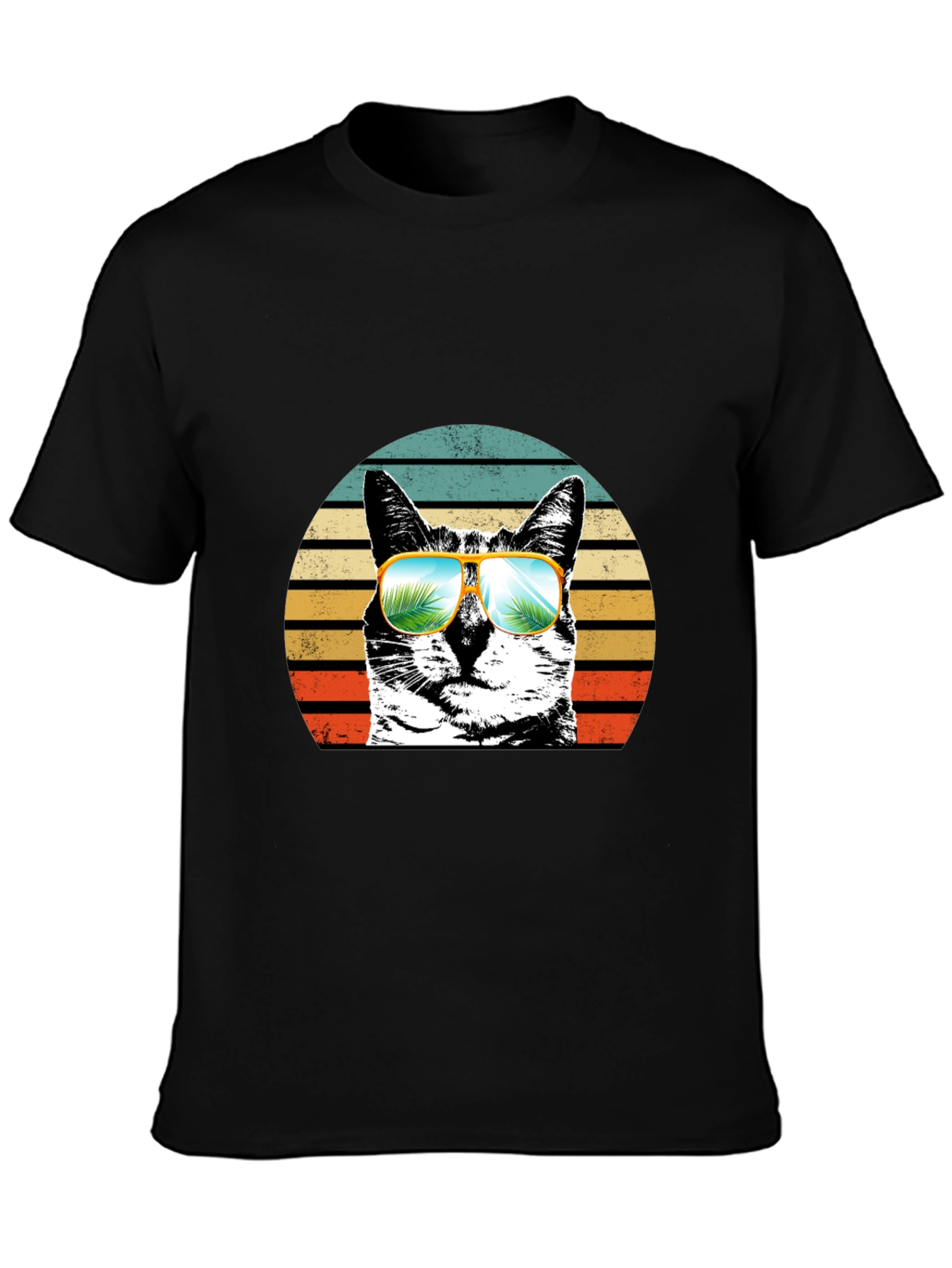 This stylish black t-shirt features a cool cat wearing sunglasses in front of a retro sunset design. The graphic is eye-catching with its vibrant colors and playful theme. The cat's sunglasses reflect palm trees, adding a touch of tropical vibes. Made from a comfortable-looking fabric, this shirt is perfect for casual wear and expressing your unique personality. Whether you're a cat lover or just appreciate a fun and trendy design, this t-shirt is sure to turn heads and become a favorite in your wardrobe. Perfect for everyday wear, or a fun gift for the cat lover in your life!
