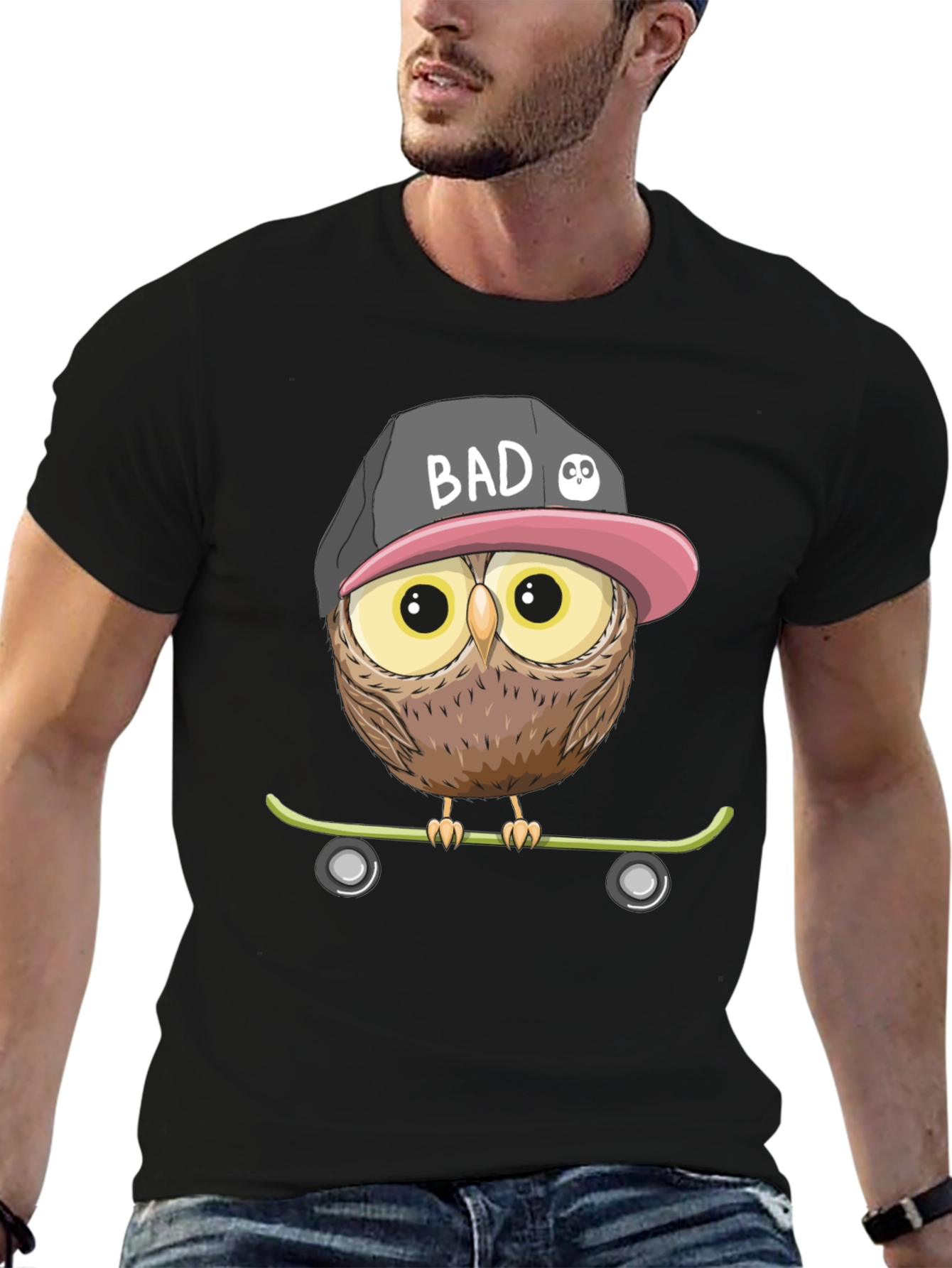 Show off your style with this unique black t-shirt featuring a cool owl design. The owl is sporting a trendy "BAD" cap and riding a skateboard, making it a fun and eye-catching graphic tee. Made from a comfortable and durable fabric, this shirt is perfect for casual wear, skateboarding sessions, or just expressing your love for owls. Its distinctive design is sure to turn heads and make a statement. Add some fun to your everyday look with this must-have owl tee!