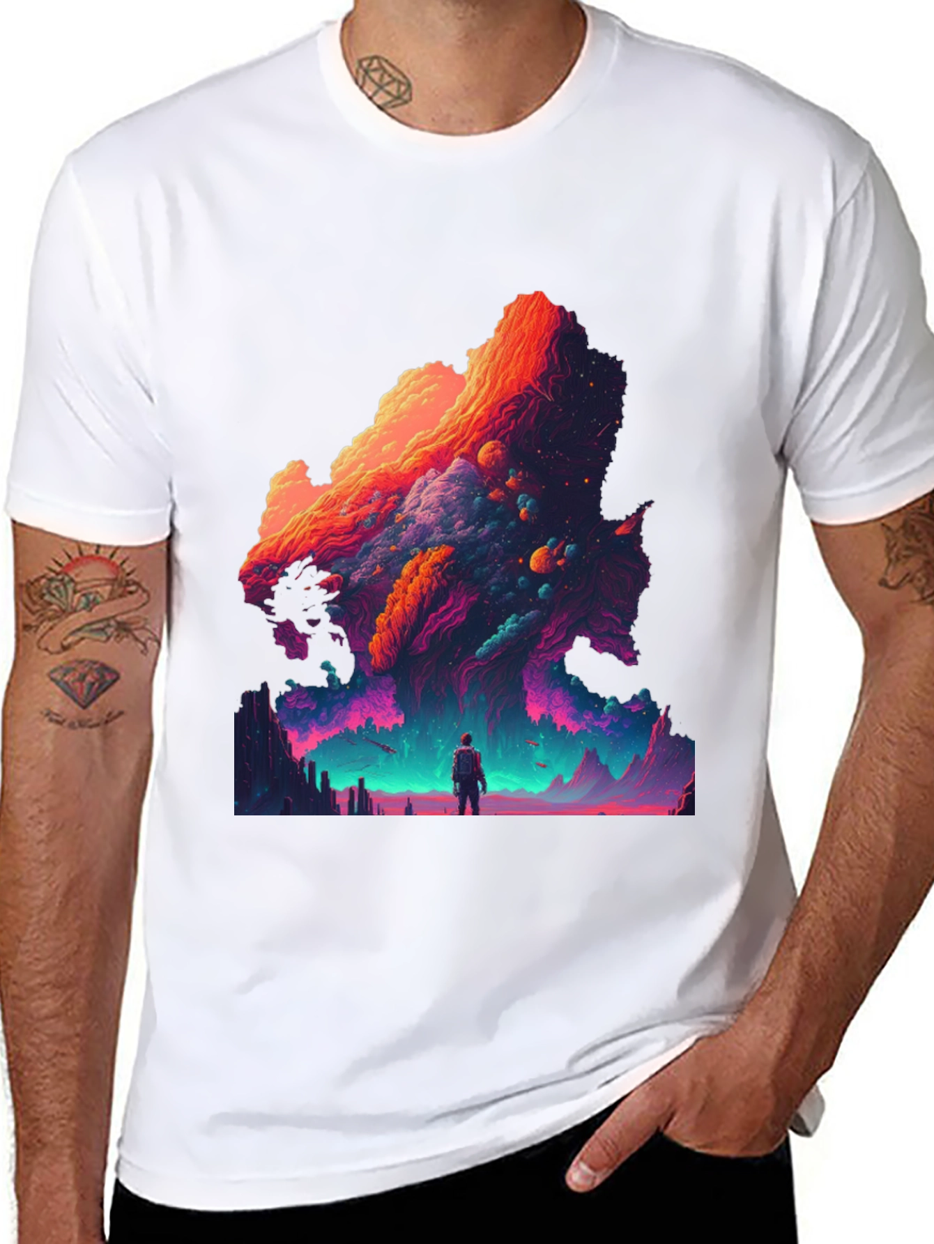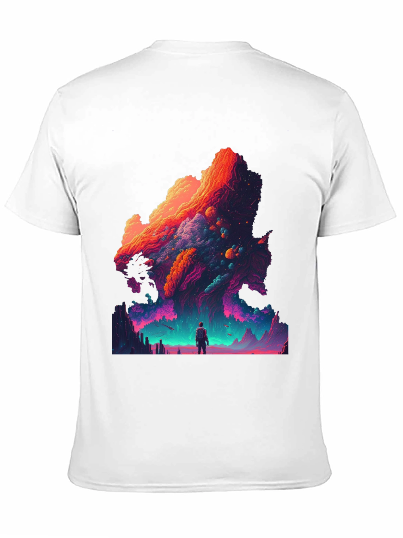 Explore the unknown with this eye-catching graphic tee! Featuring a bold and vibrant cosmic dreamscape design, this black t-shirt is sure to turn heads. The vivid colors of the surreal landscape pop against the dark background, creating a mesmerizing effect. Made from a comfortable material, this shirt is perfect for everyday wear or as a statement piece. Wear this tee and immerse yourself in another world. Great for casual outings, concerts, or expressing your unique style. Available in multiple sizes.