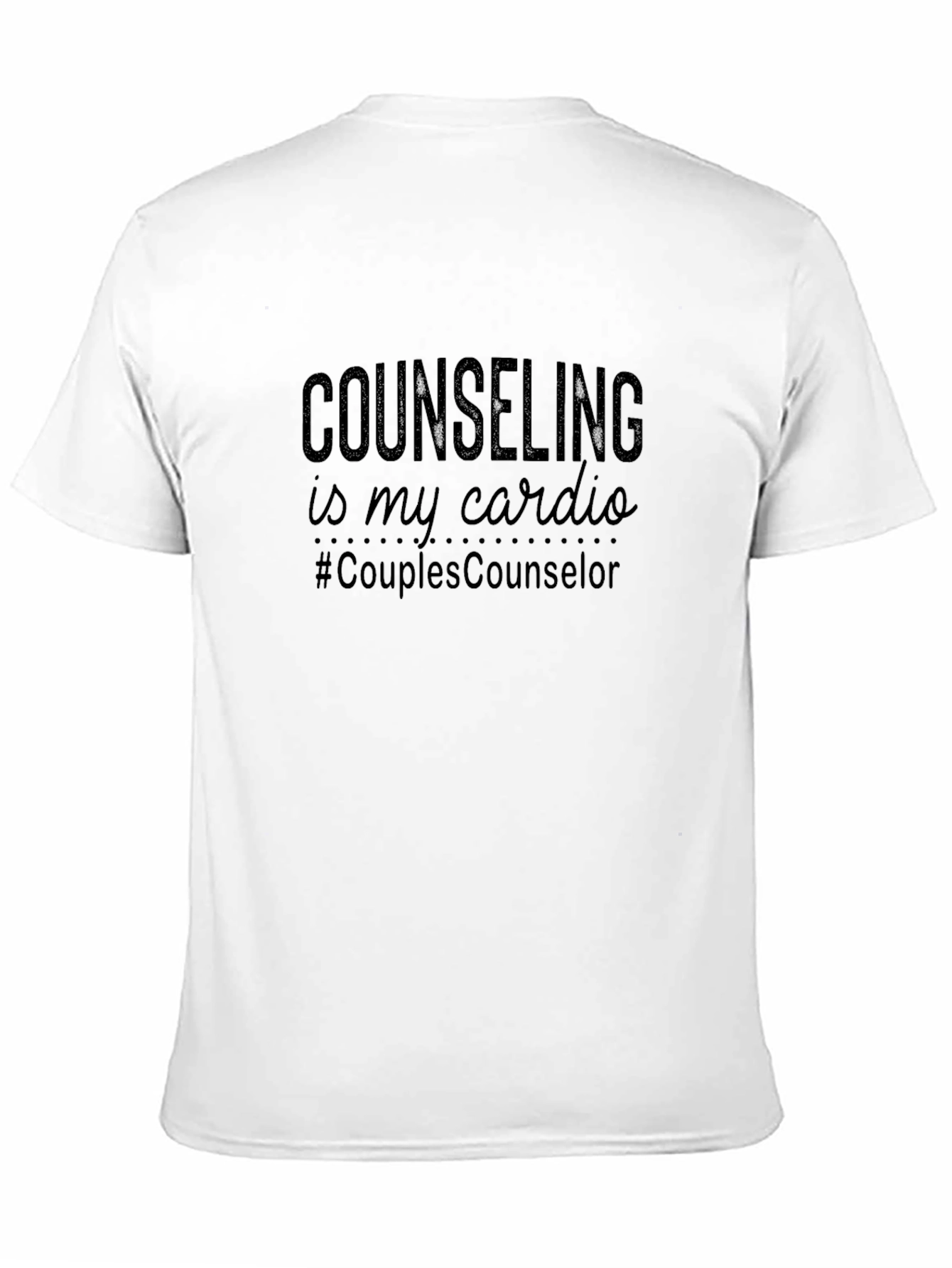 Show off your passion for counseling with this black graphic t-shirt. The shirt features the phrase 'Counseling is my cardio' along with '#CouplesCounselor,' making it a fun and relatable piece for therapists and counselors. Made from a comfortable material, this tee is perfect for casual wear, office settings, or counseling conferences. Let your clients and colleagues know that you love what you do with this unique and stylish t-shirt.