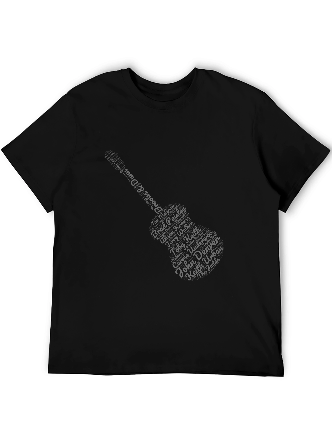 Showcase your love for country music with this unique black T-shirt. Featuring a creative design that forms the shape of a guitar using the names of iconic country music artists such as Tim McGraw, Brad Paisley, Carrie Underwood, and more, this shirt is a must-have for any country music fan. The shirt appears to be made from a soft, comfortable fabric, perfect for everyday wear. The classic fit and bold design make it a great addition to any casual outfit. Wear it to concerts, casual outings, or simply to express your passion for country music.