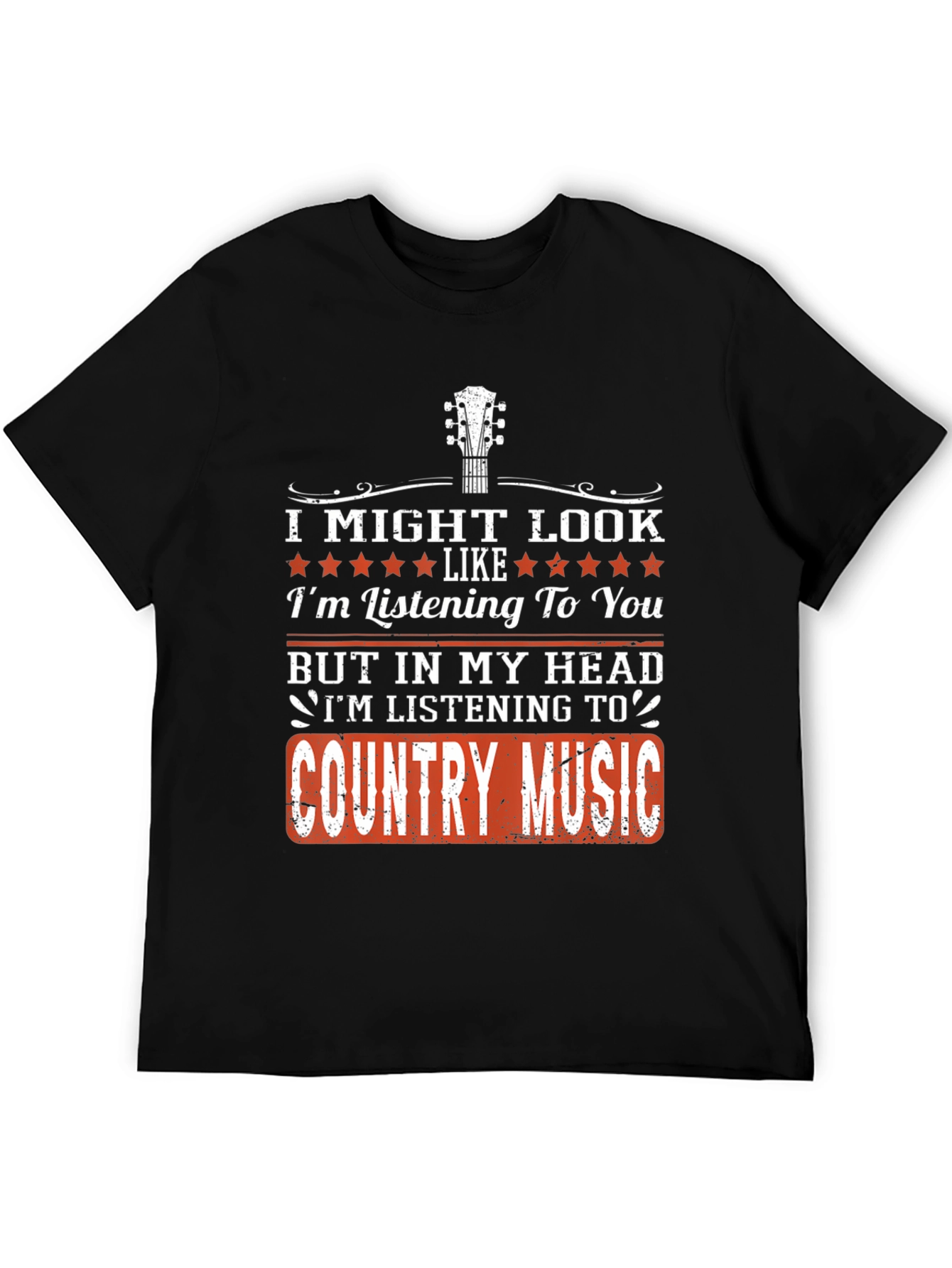 Show off your love for country music with this fun graphic tee! This black t-shirt features a playful design that reads "I Might Look Like I'm Listening To You But In My Head I'm Listening To Country Music". The text is styled with a distressed effect, giving it a vintage vibe. A guitar graphic tops the design. This tee is perfect for casual wear, concerts, or any occasion where you want to express your passion for country music.